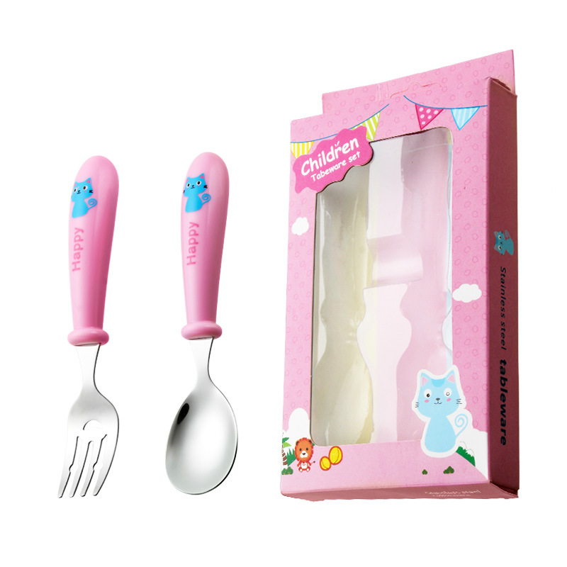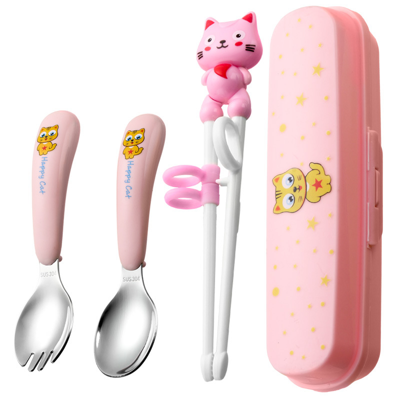 yellow cat-pink-curved fork spoon and chopsticks-pink box