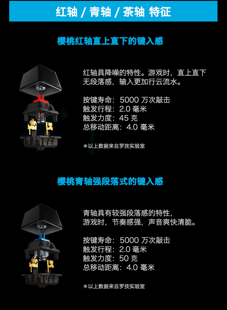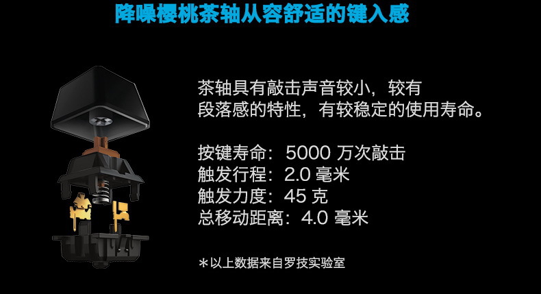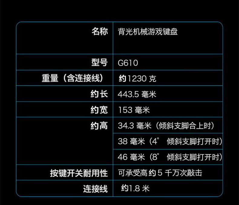 G610 keyboard trigger keystroke 2.2mm, pressure grams 50 grams, total stroke 4.4mm; Red axis departure keystroke 2mm, pressure grams 45 grams, total stroke 4mm, all consistent with Cherry official parameters, users can experience the original Cherry shaft body feel.