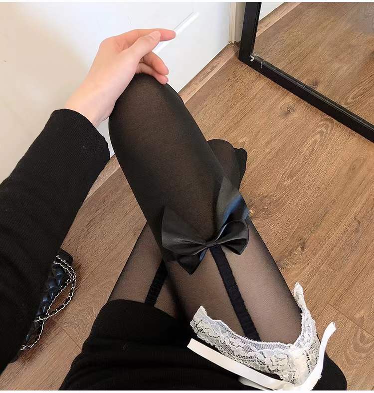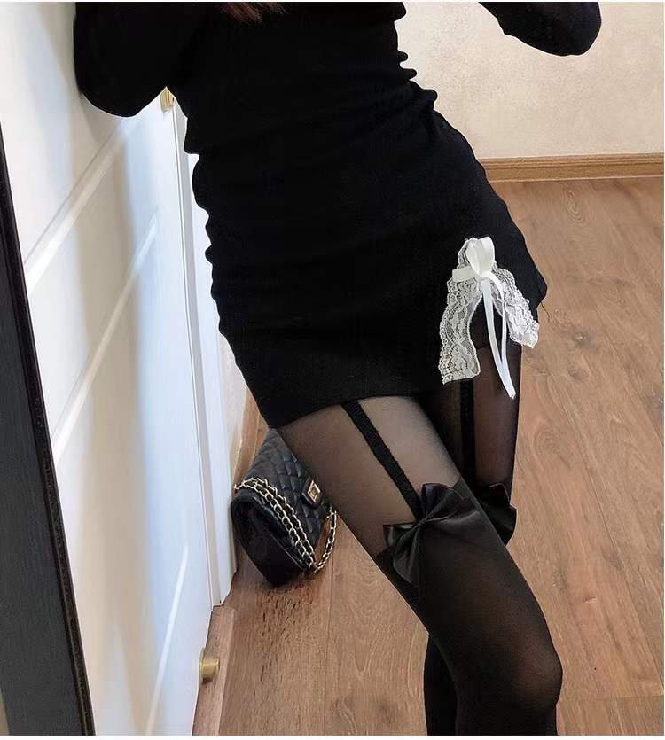 Japanese Cute Fake Long Tube Stitching Bow over the Knee JK Uniform Sling Black Silk Stockings White Suspender Thigh High Socks