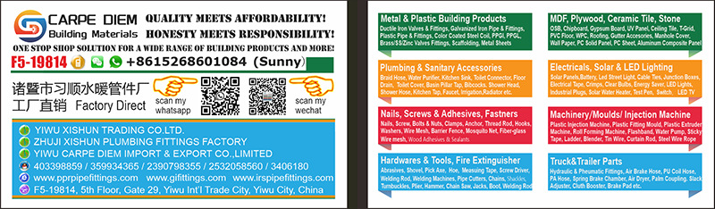 Yiwu Xishun Trade Co., Ltd. Founded in2015, operating all kinds of pipes and pipe fittings online and offline, aiming to become efficient and professional hardware plumbing building materials one-stop supplier. Offline physical stores are located in Zhuji store and Yiwu International Trade City building materials area, mainly engaged in various materials of water supply and drainage pipe fittings products, PVC pipe fitting, PPR pipe fittings, PPR pipe, PVC pipe and other products. PVC pipe fitting standards mainly include: NBR 5648,SCH80,SCH40 ,ASTM D2466,BS 4346,ASTM D2665, etc. PPR pipe fittings ball valve, PVC pipe fittings, PE pipe fittings, irrigation series, expansion screws, nails, wrought iron, copper valve, stainless steel extension connector, pipe clamp, Masteel pipe fittings, square pipe round pipe and other building materials. All products are directly supplied by manufacturers, with high quality and low price.