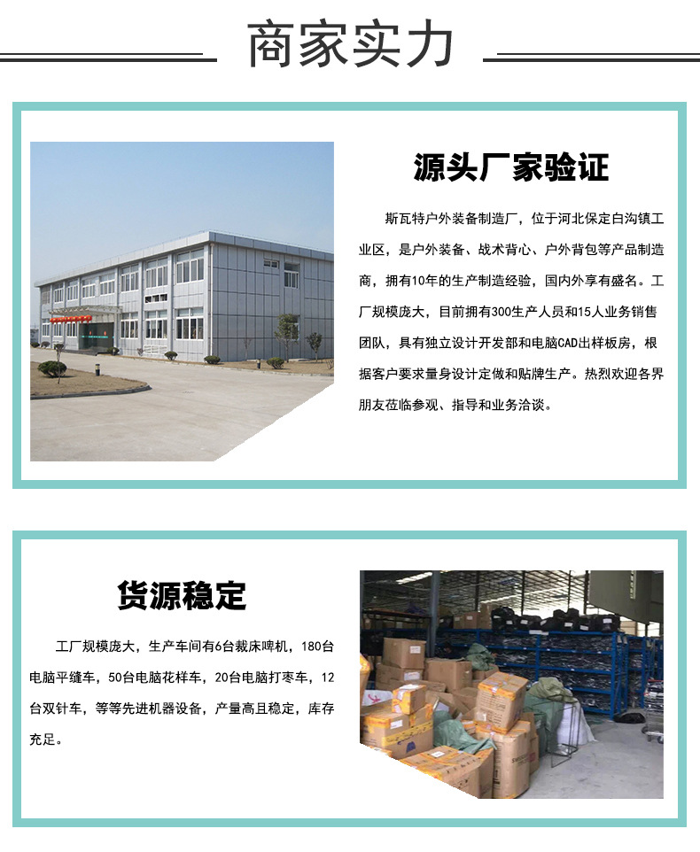 Swat outdoor equipment manufacturing factory is a professional production and wholesale camouflage clothing real CS protective products outdoor development workout devices production company. Samples can be processed and customized camouflage clothing tactical vest camouflage clothing camouflage net, etc. Our company has 15 years of professional experience in the design, manufacture and sales of professional outdoor products. It has a development and design team of 20,000 square meters of factory buildings, 150 imported equipment and 50 people, there are more than 500 production workers and 3 modern production lines with an annual output value of 0.1 billion yuan. Products are exported to the United States, France and other developed regions.