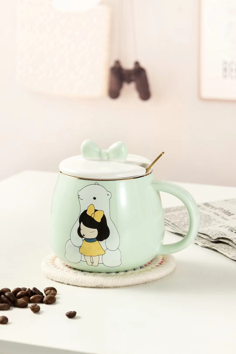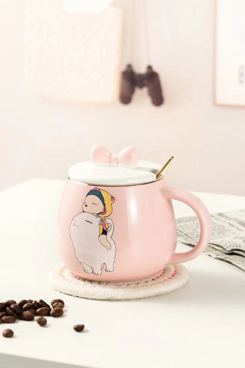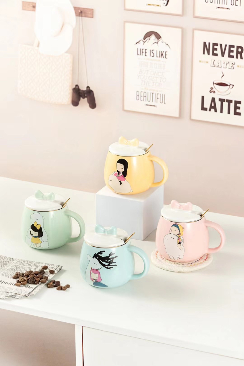 Hot Selling Cartoon Ceramic Cup Adorable Girly Style Mug with Cover with Spoon Coffee Cup Office Water Glass