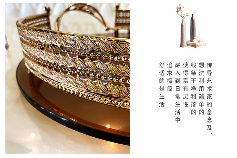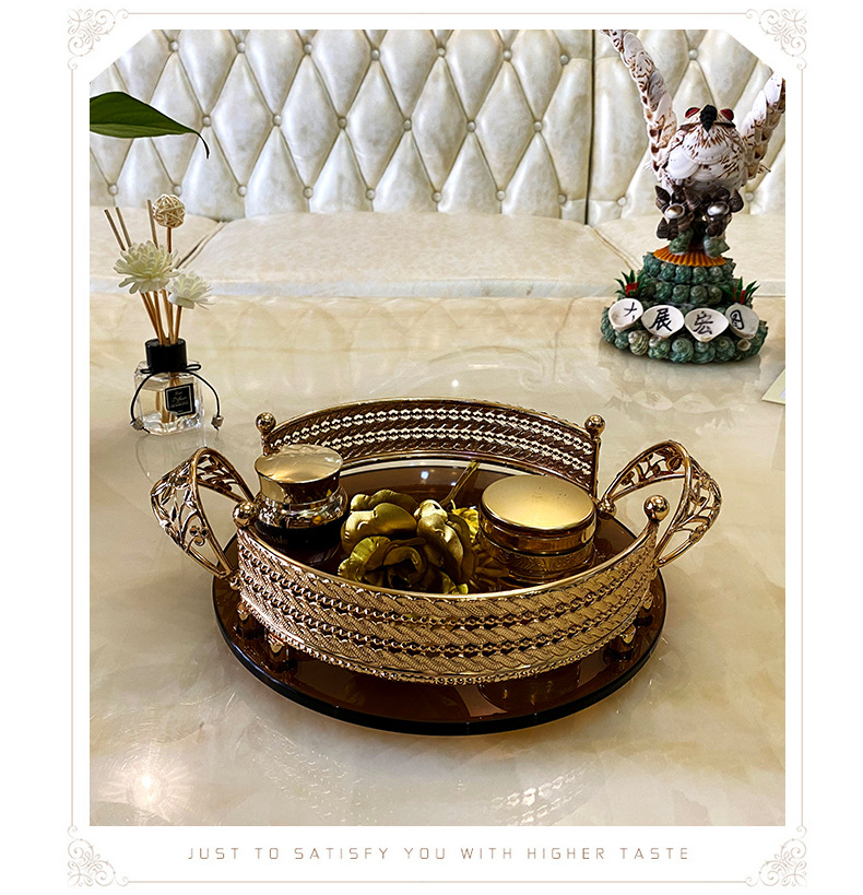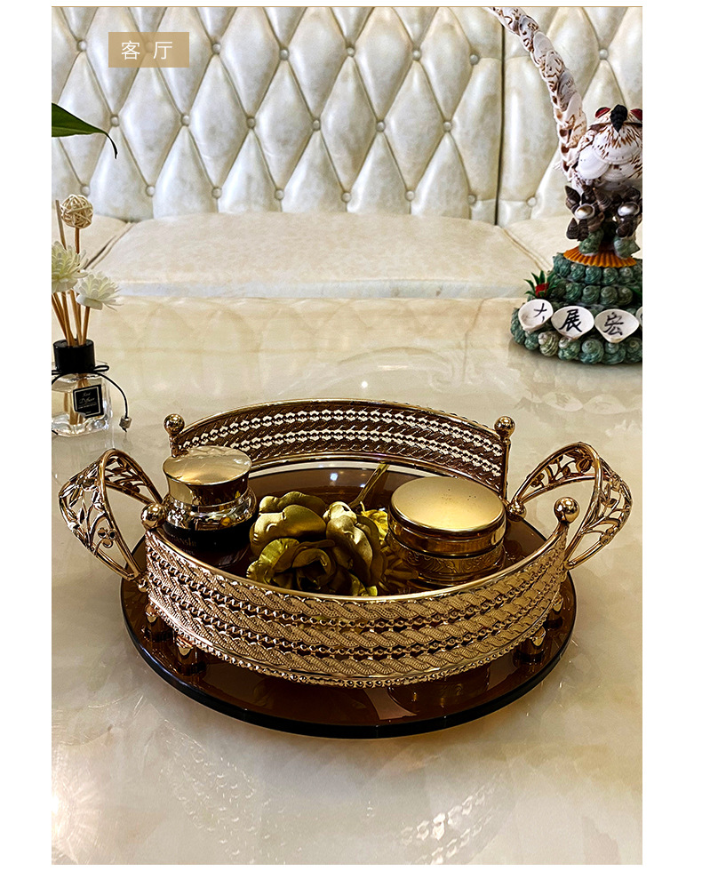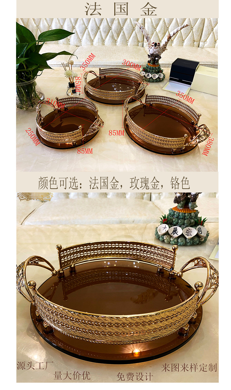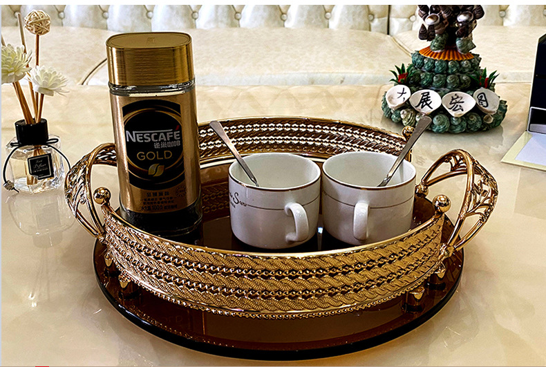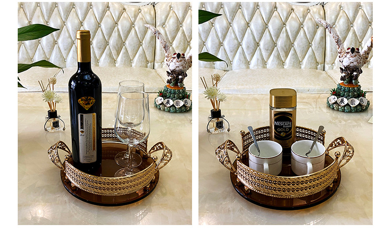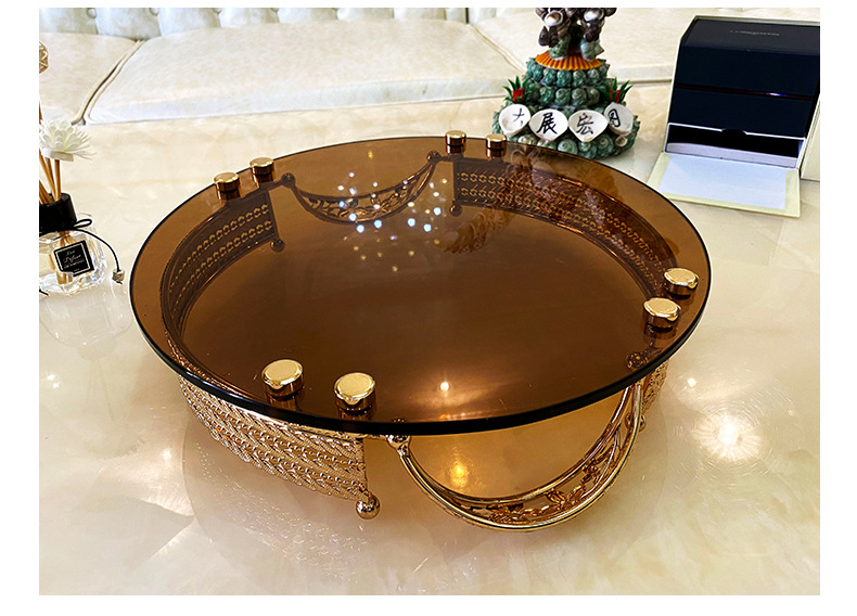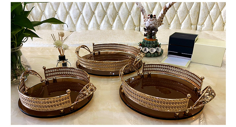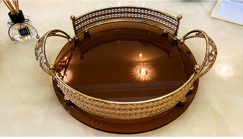 High-End Luxury Light Luxury Metal Brown Surface Glass Storage Tray French Red Wine Glass Tray European Style Household Fruit Plate