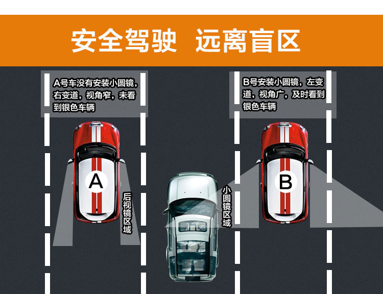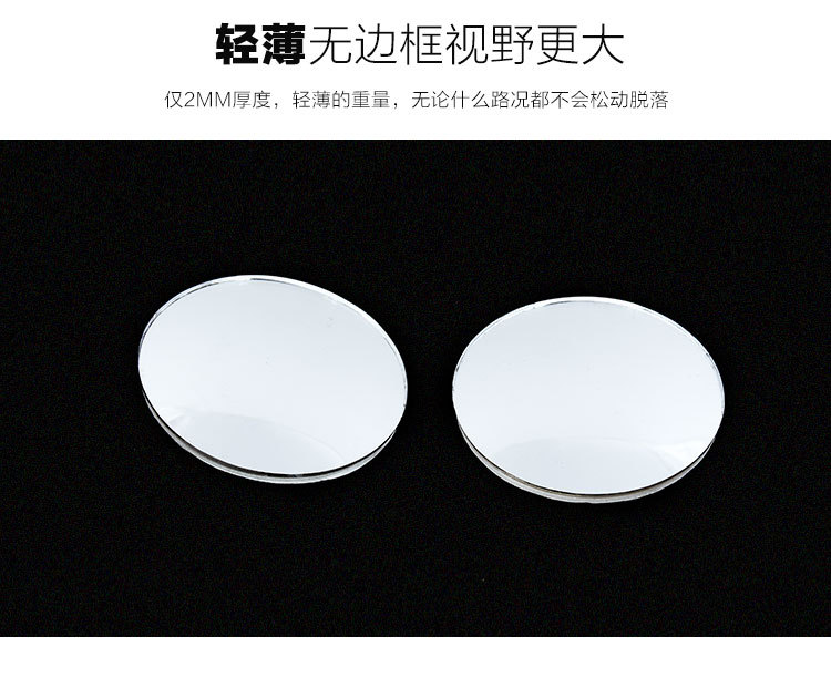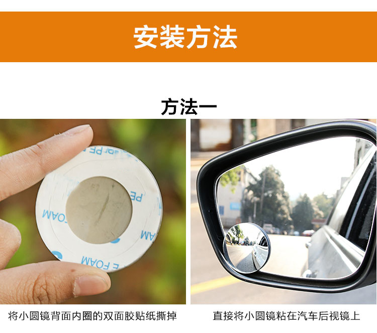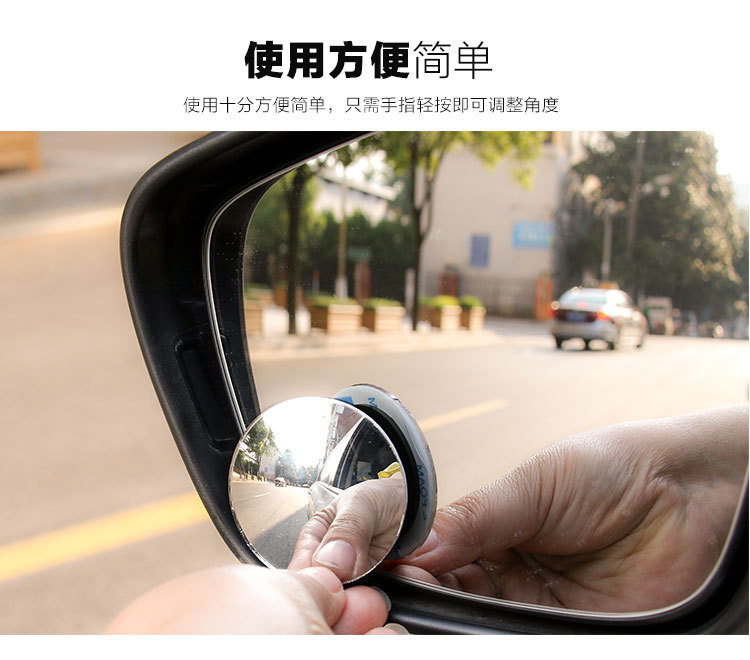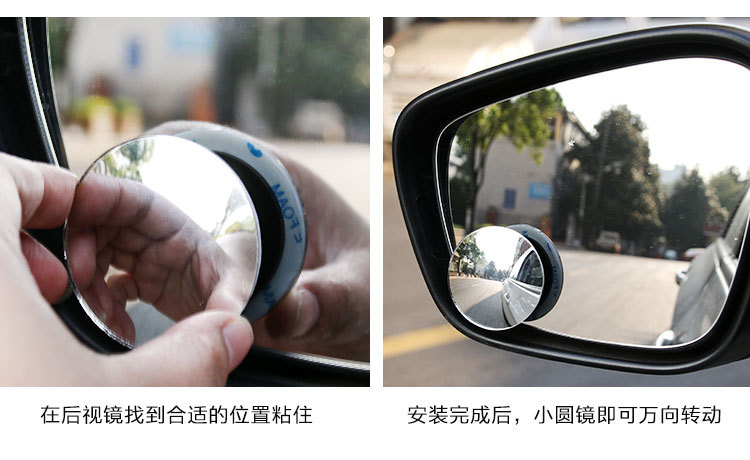 [Product features]: 360 adjustable angle, 360 adjustable angle fan mirror, spherical convex blind spot removal small fan mirror, attached to the reflector, can effectively eliminate blind spots and expand vision. Stereo wide-angle lens can eliminate blind spots in the field of vision, 49mm large mirror can effectively expand the field of vision; Install the product properly on the side of the driving position and the rearview mirror.