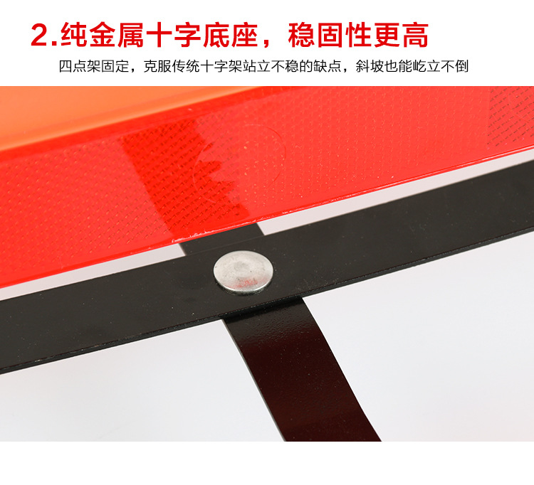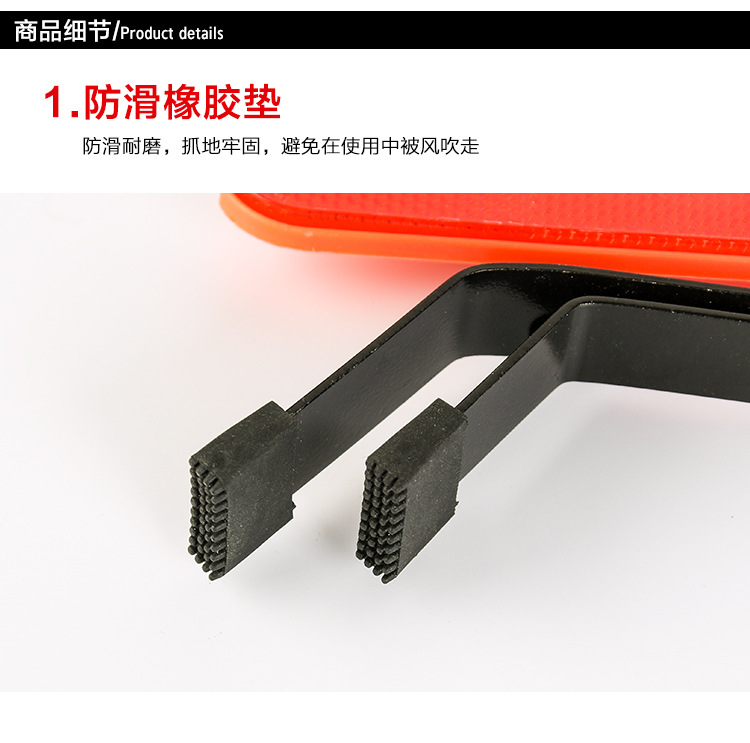 1. When using, take out the faulty car in the box to warn signboard, hold the bottom and open the support on both sides of the bottom respectively. Place the open signboard on the ground, pull up the left and right reflector, and insert the pin on the left reflector into the bottom of the open slot on the right reflector.