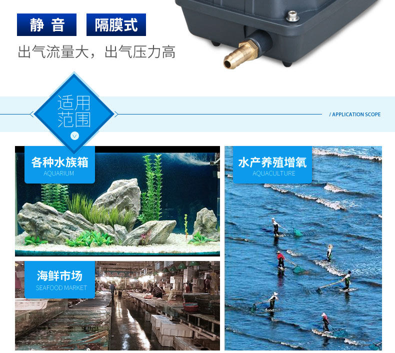 Air pump series: oxygen pumps, AC/DC dual-use pumps, battery pumps, submersible oxygen injection pumps, DC air-filled oxygen generators, air compressors, vortex air oxygenators, etc.