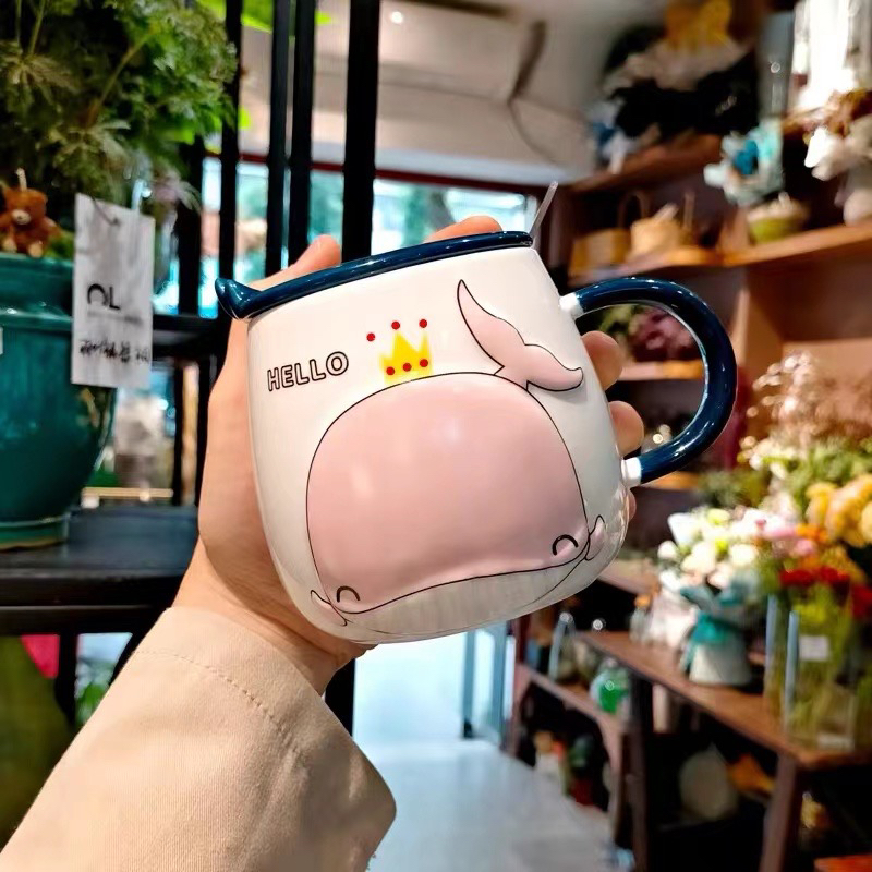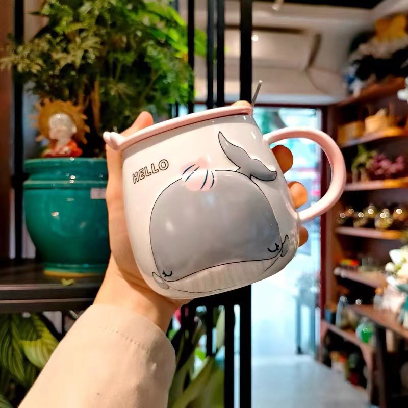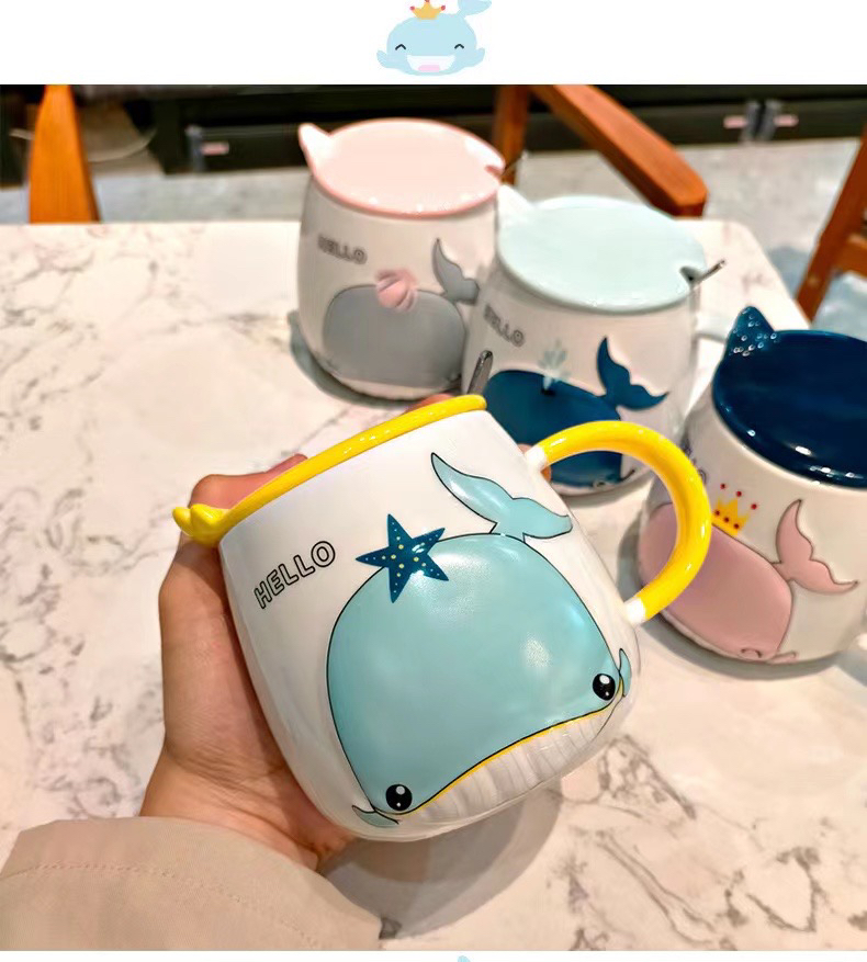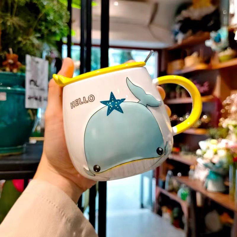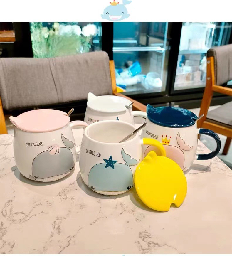 Hot Selling Cartoon Whale Ceramic Cup with Cover with Spoon Coffee Cup Creative Mug Office Water Glass