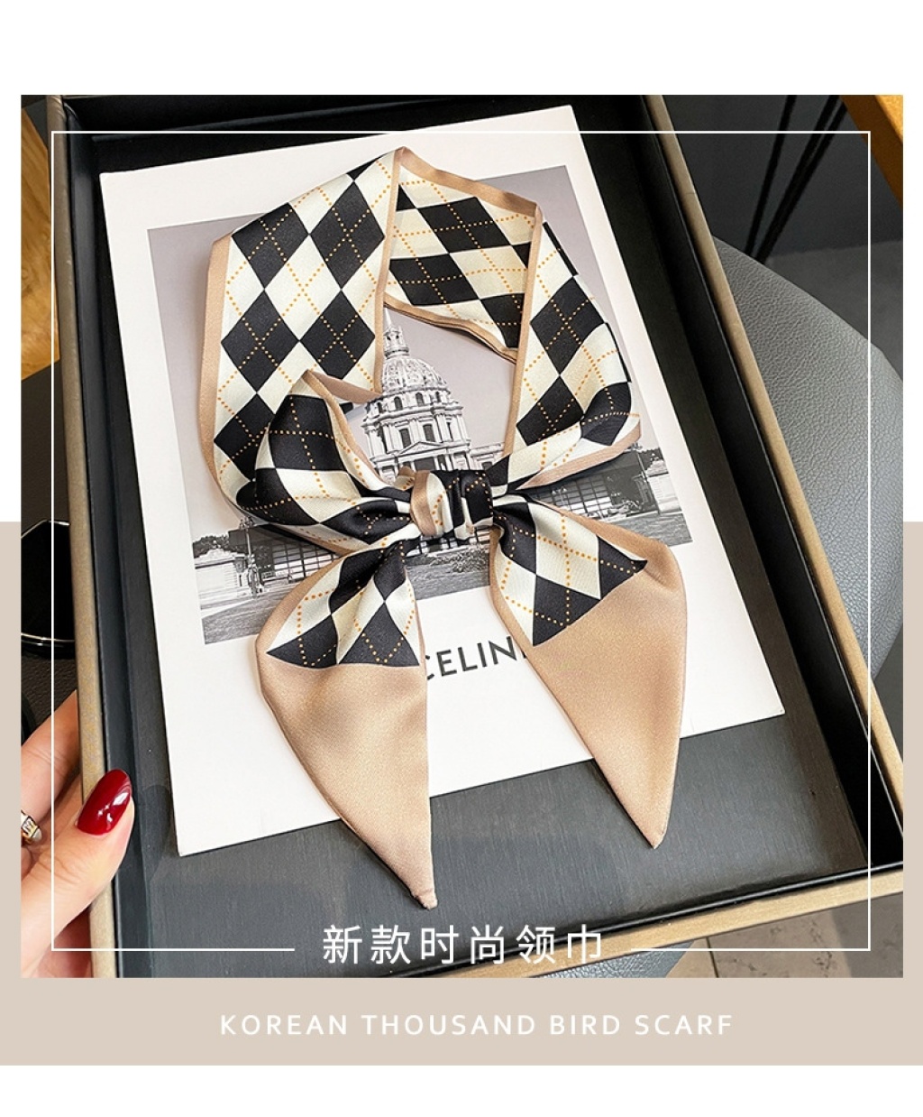 2022 new spring and autumn diamond patterns western style thin narrow long scarf diagonal dual-use hair band scarf decorative square scarf