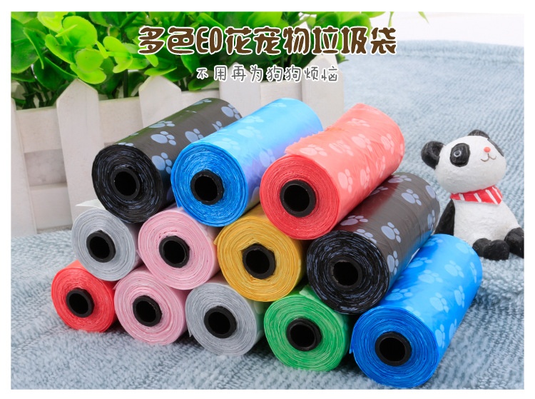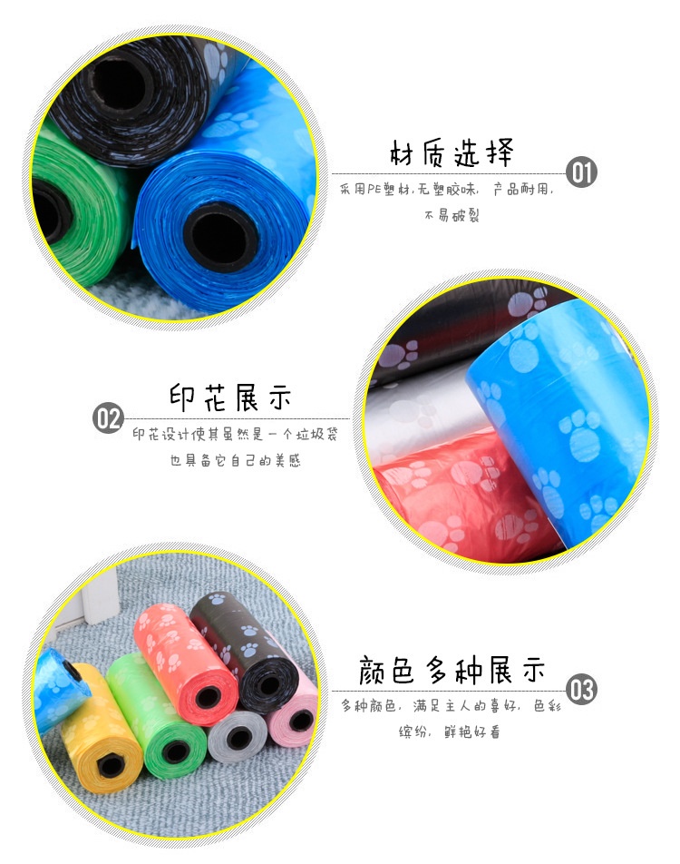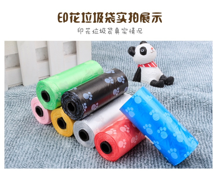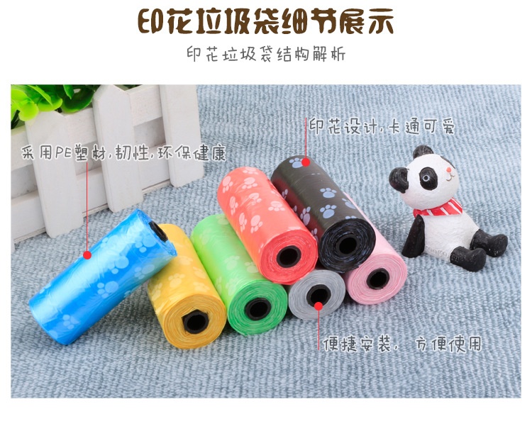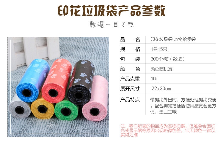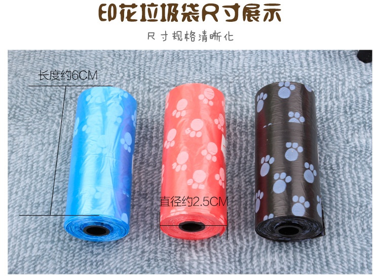 About Product:Name: printed pet stool bag/garbage bag (roll) specification: 15 bags/roll diameter 3.3cm, height 6cm cylindrical, product introduction: it is suitable for puppies or Xiao Mao to take dogs out with stool bag container, which is convenient to handle dog feces. It is more convenient and hygienic to use with dog pooper scooper
