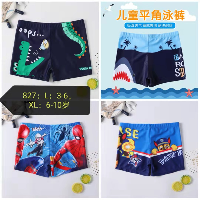 Cartoon boy swim trunks with flat-front design, made of polyester and spandex fabric, with good feel and high elasticity. Available in two sizes: L for ages 3-6 and XL for ages 6-10.
