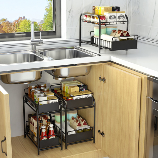2-Layer Floor Kitchen Storage Sink Rack Layered Pull-Out Cabinet Bathroom Lower Shelf