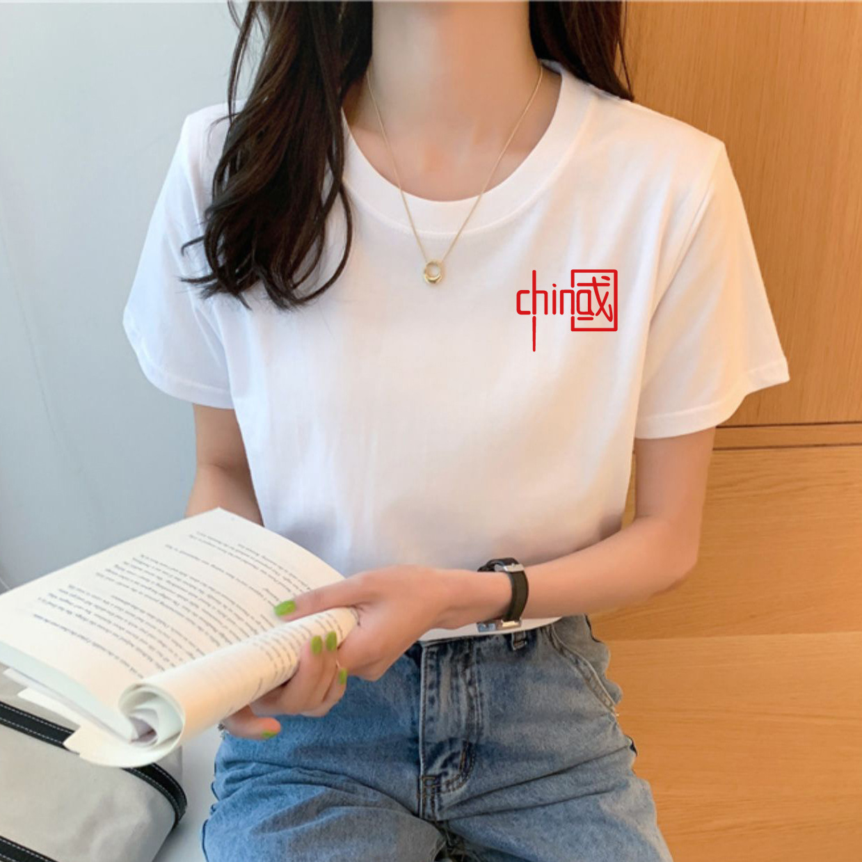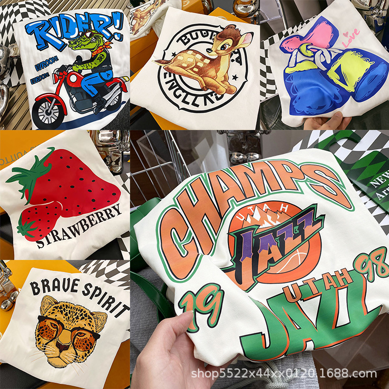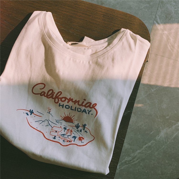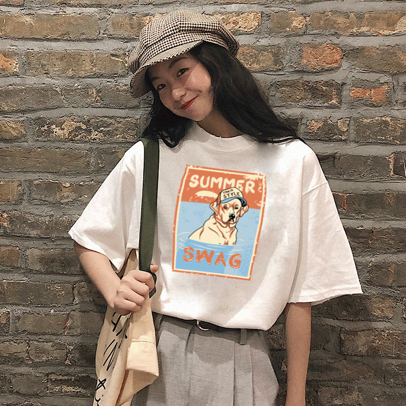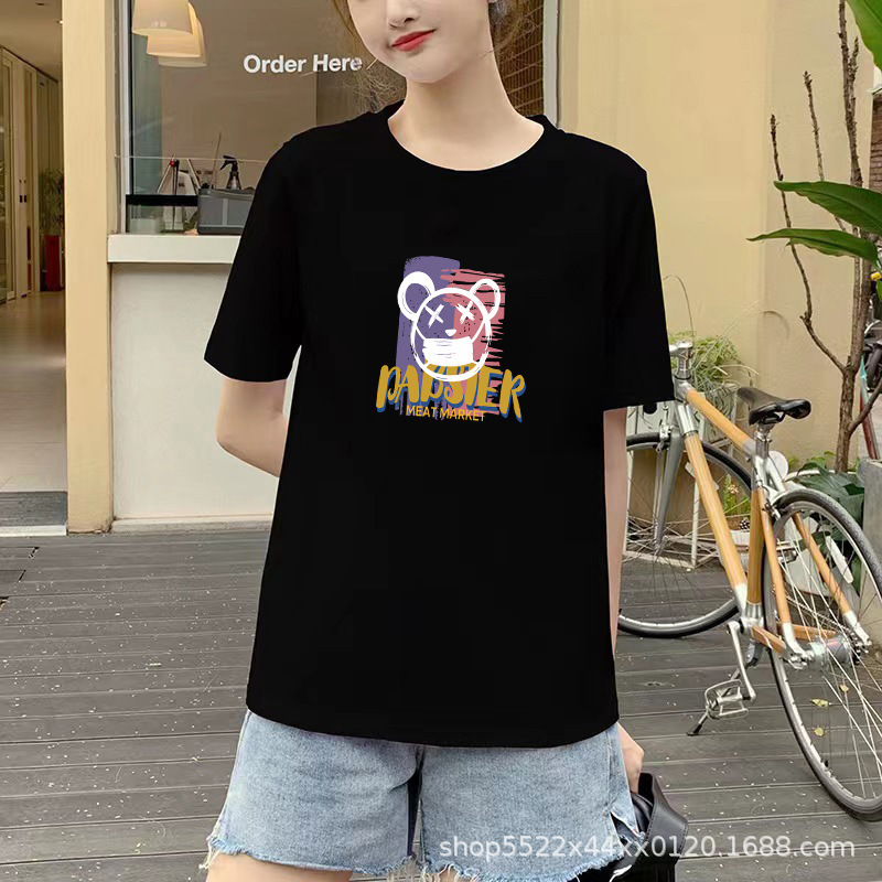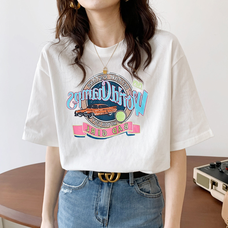New Korean Style Loose-Fitting Women's 200G Cotton T-shirt Short-Sleeved Women's Spring and Summer Bottoming Printed Cute round Neck Women's Clothing