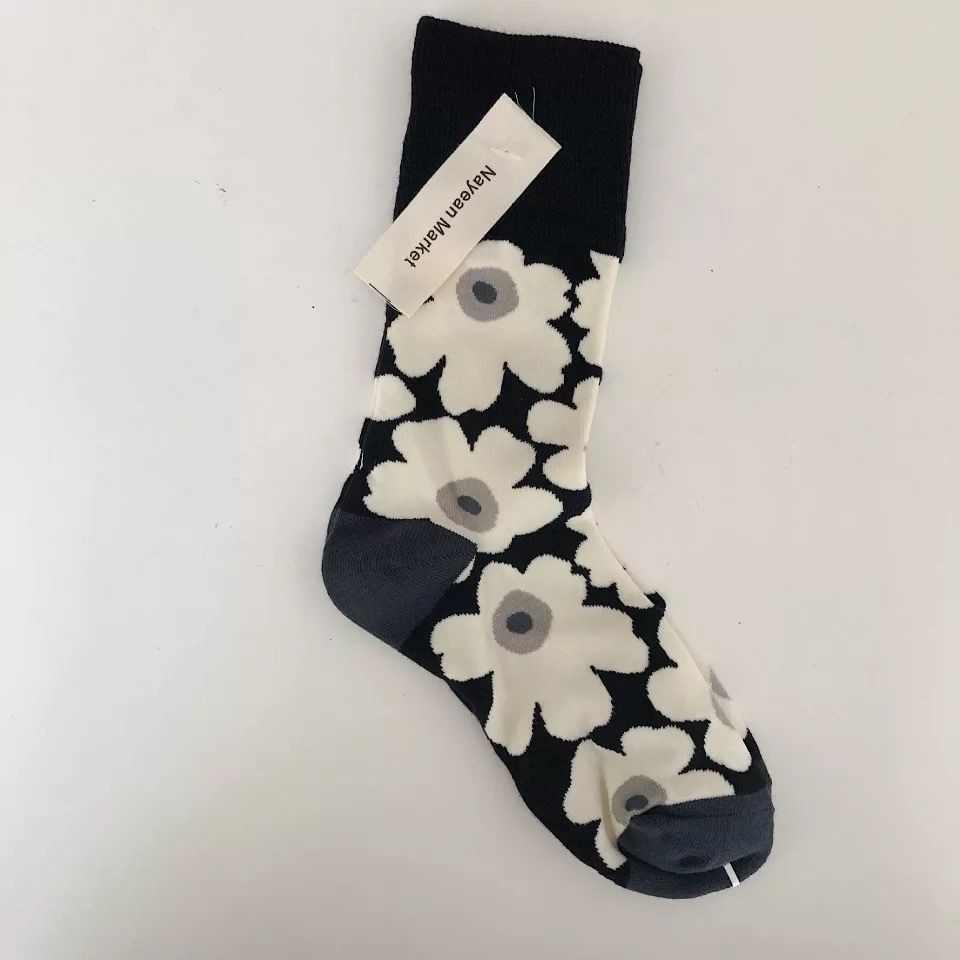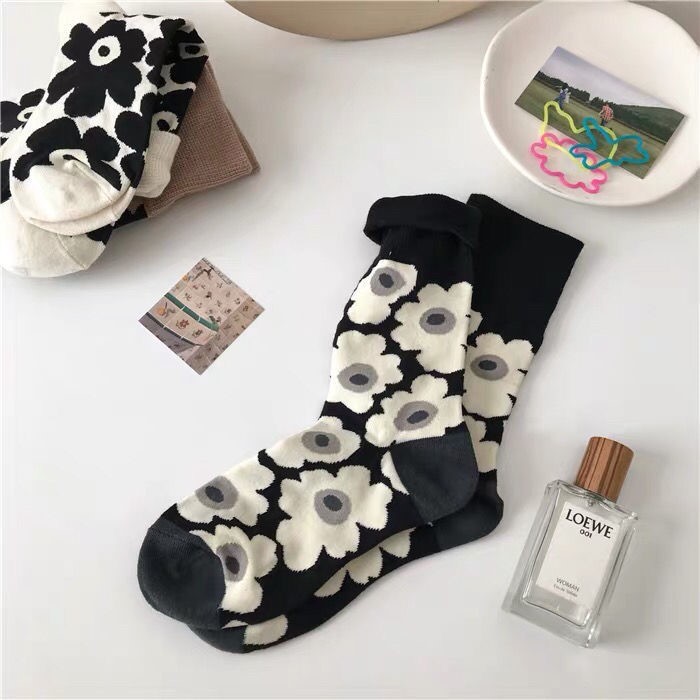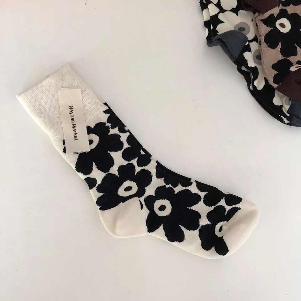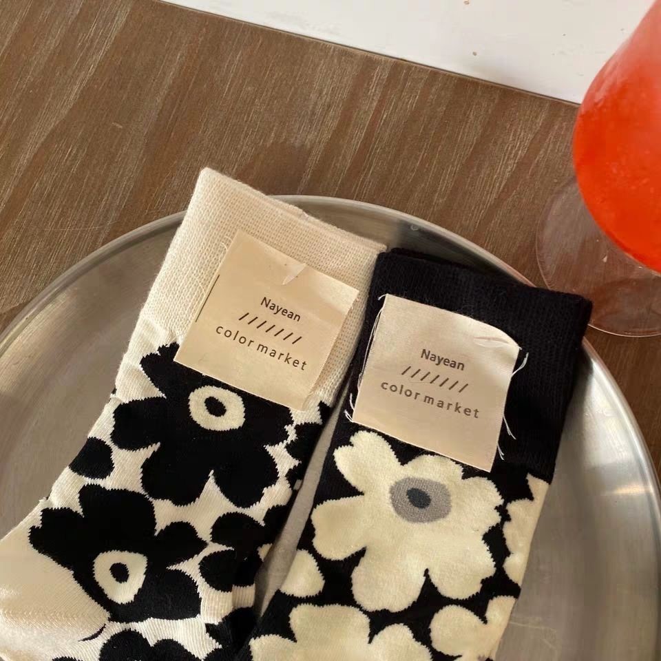 Japanese Chic Children's Retro Xuan Ya Flower Socks Women's Mid Tube Stockings Spring and Autumn Black and White Girl's Heart Bunching Socks