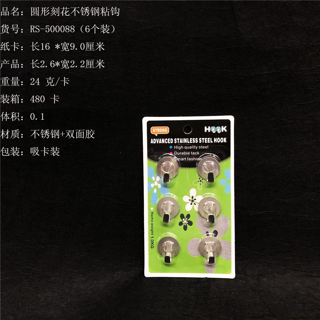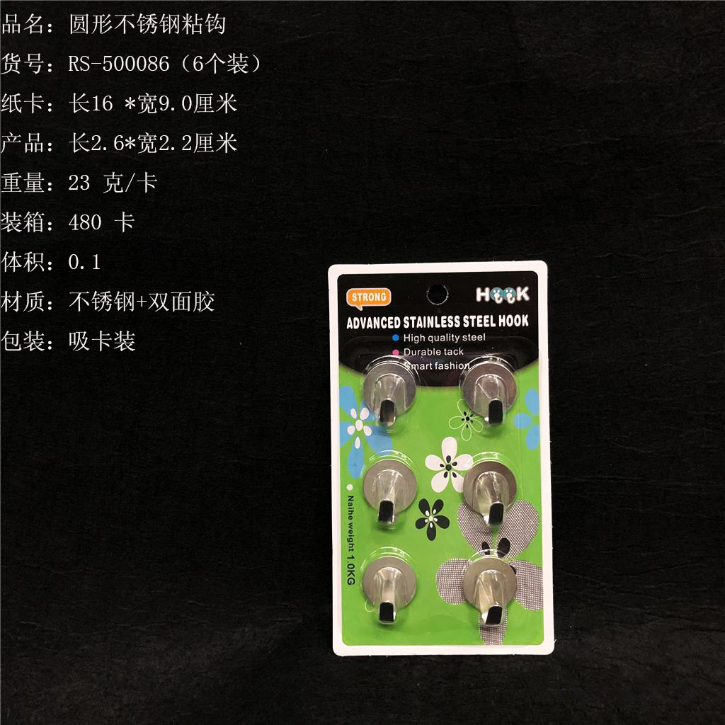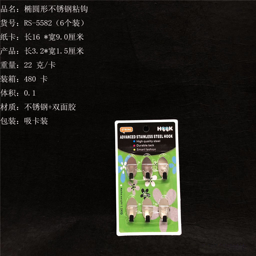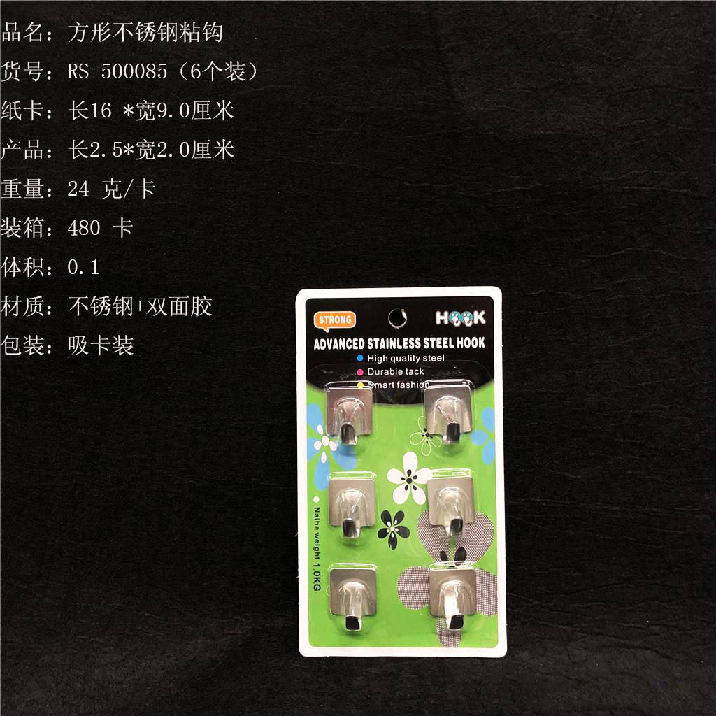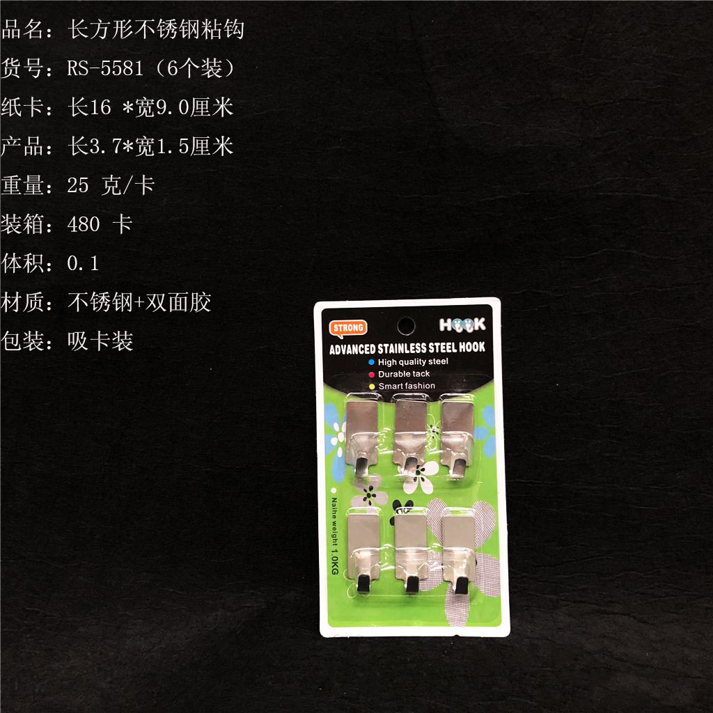 ITEM NO.【Product Model Number】: RS-5581 NAME【Product Name】: Rectangular Premium Stainless Steel Hooks (6 pieces) QTY【Quantity】:480 cards "CBM【纸箱体积】:0.07 Material【Product Material】: 201 Stainless Steel Color【Product Color】:Clear Weight【Product Weight】:24 grams (per card) Packaging【包装方式】:6个一吸卡" "Packaging【包装方式】:6个一吸卡 W.G【Gross Weight of a Full Container】: 12.5 kilograms