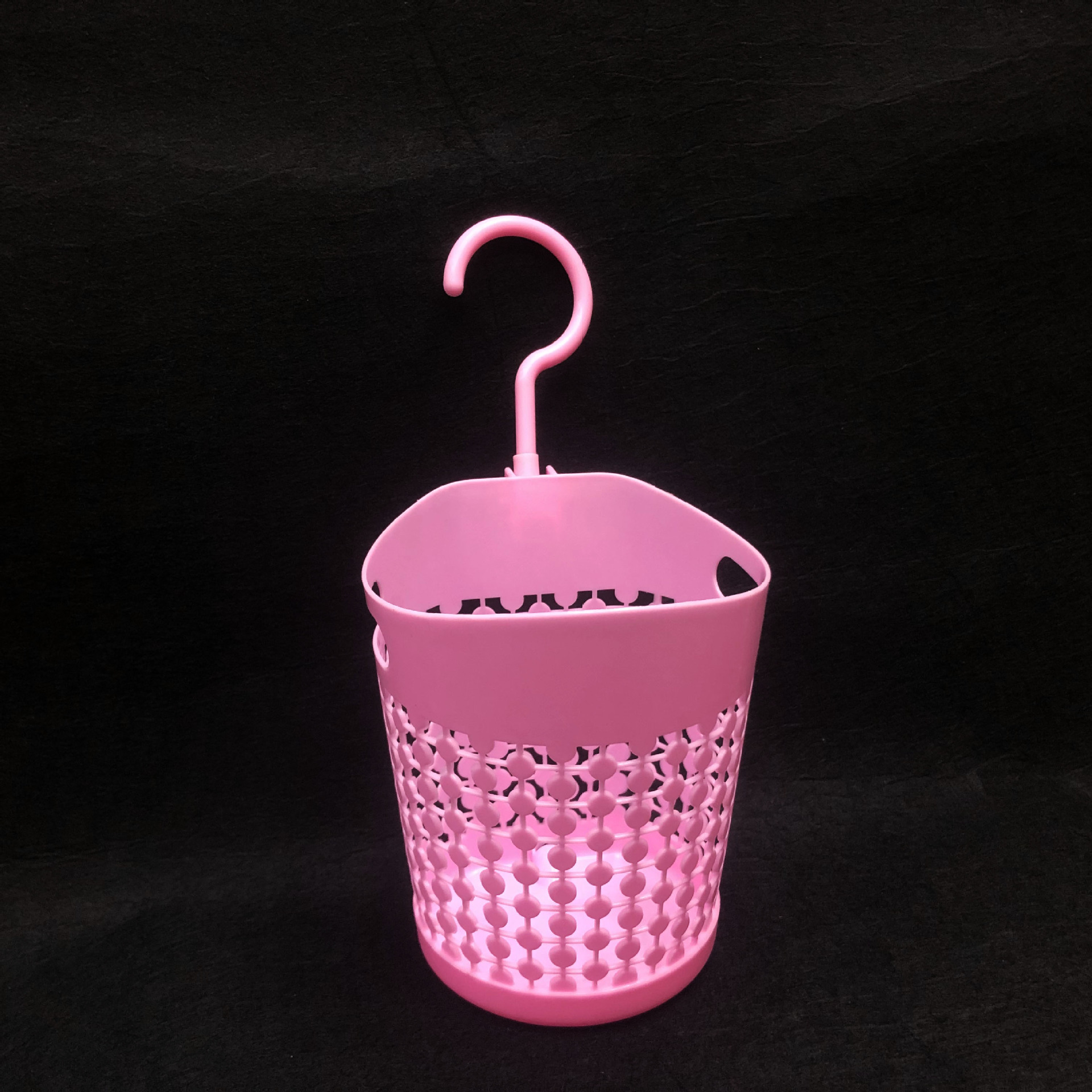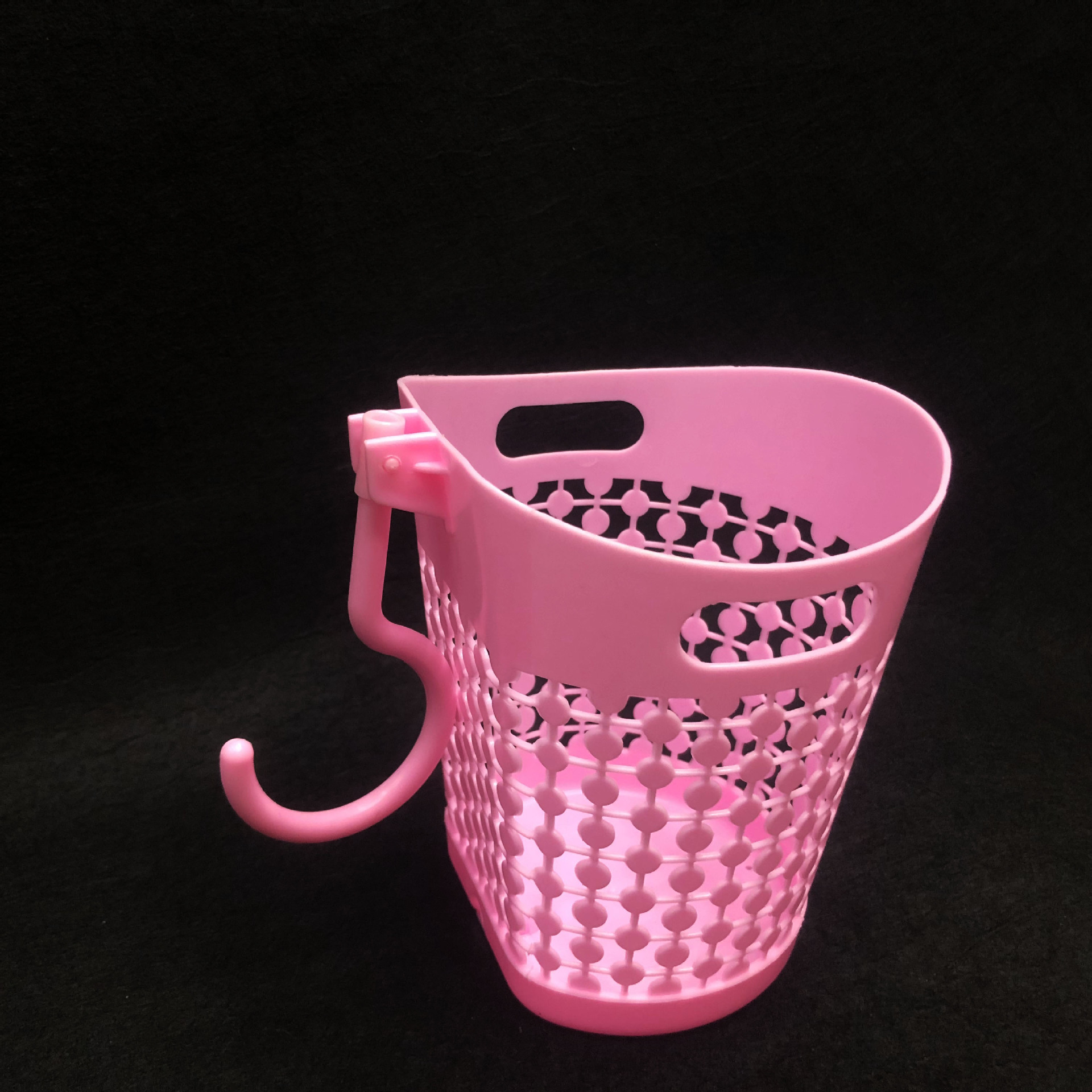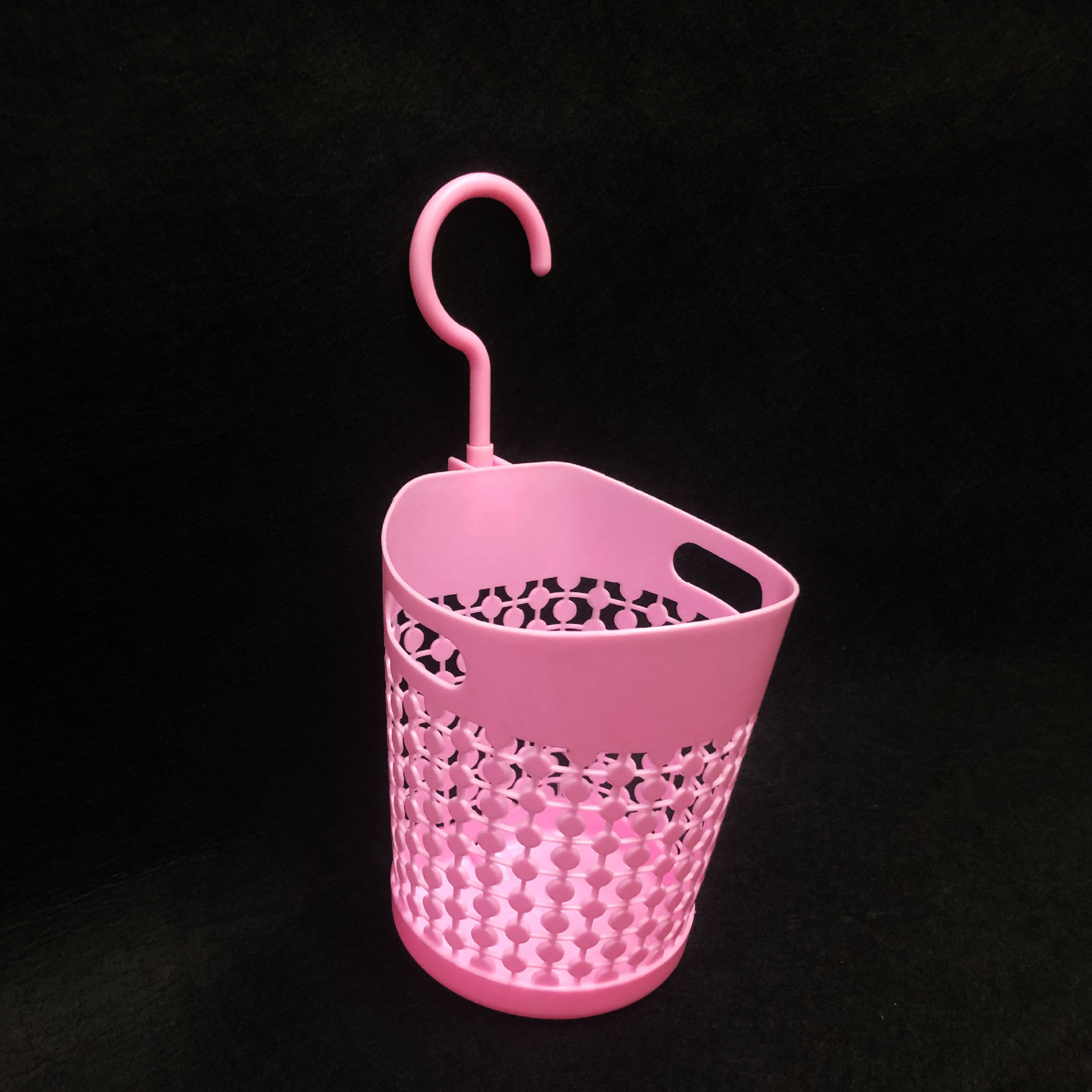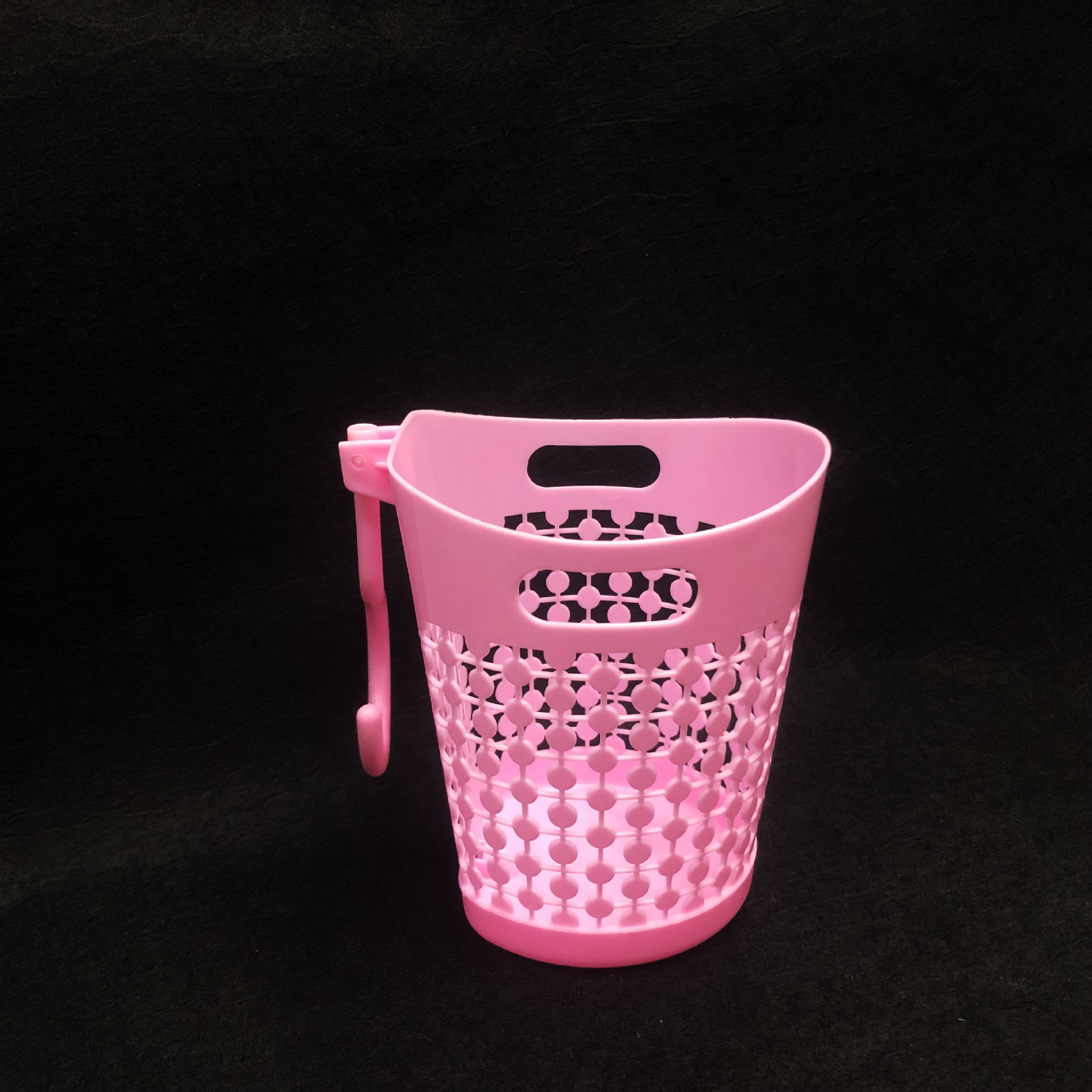 镂空挂钩收纳篓/办公室电脑桌面垃圾篓/可挂杂物收纳吊篮采用优质的PP材质制作而成,材料不含双酚A(BPA free)清新无异味,边缘镂空设计,高端大气上档次,糖果色色系,色泽前卫时尚,看去很简洁漂亮,手感圆润光滑,外型强度高耐用,硬度好,抗老化,寿命长,不怕摔,灰尘油污容易清洁,耐垢性好,低温下使用能保持相当好的韧性,经久耐用,方便收纳,可用来家居装饰,杂物收集,清洁收纳,摆件插花等,非常实用。带活动挂钩设计,吊篮可以悬空挂在任何你想挂的地方,方便收纳。是您居家生活的好伙伴,是家庭日用的优先选择。