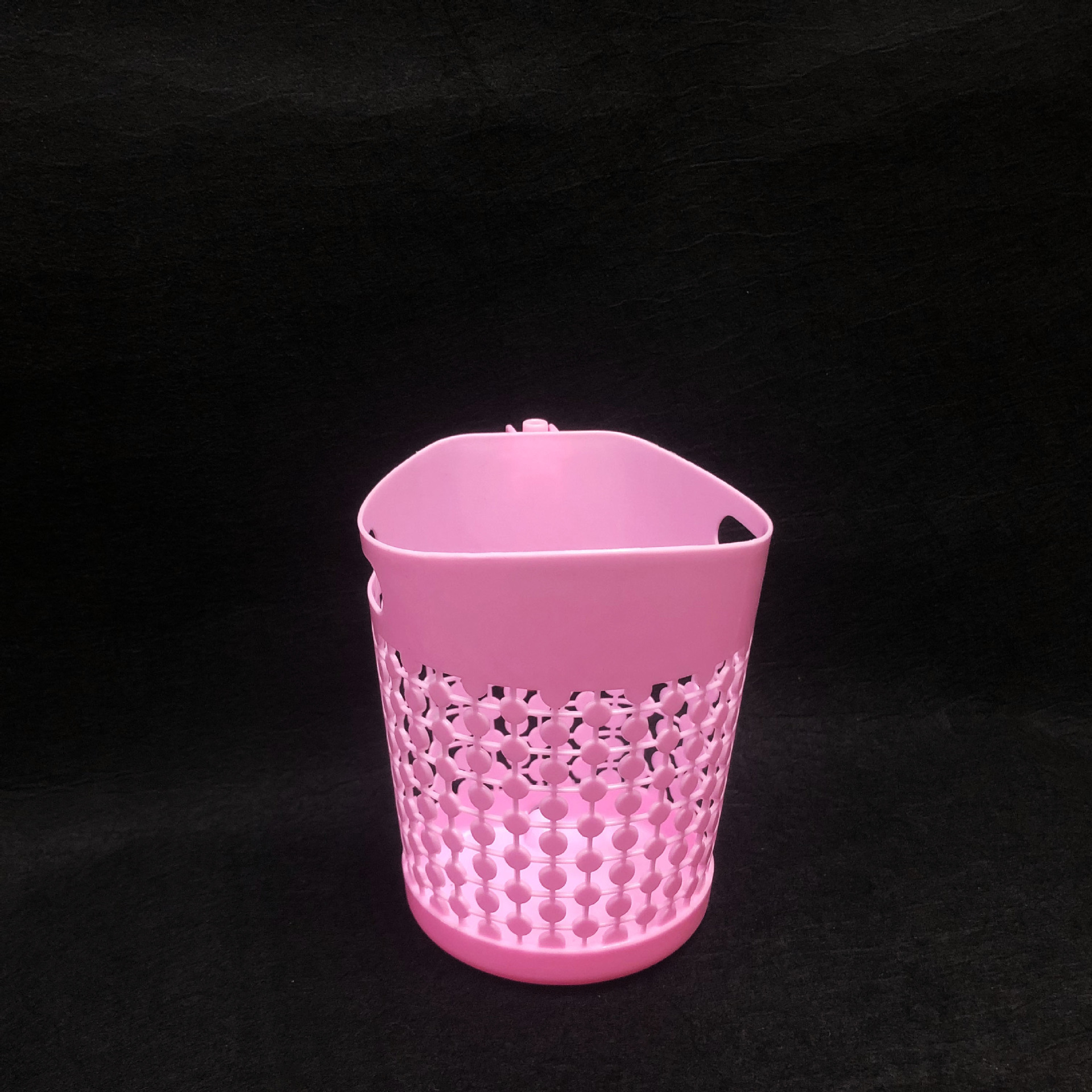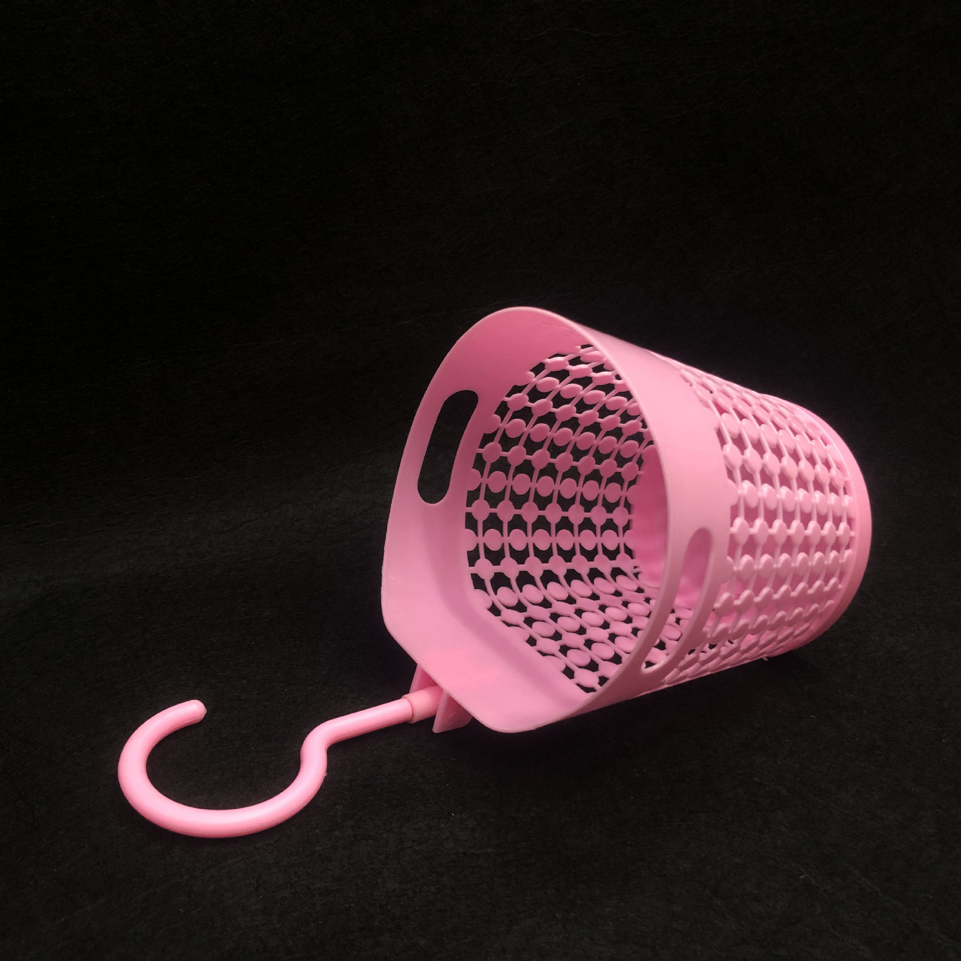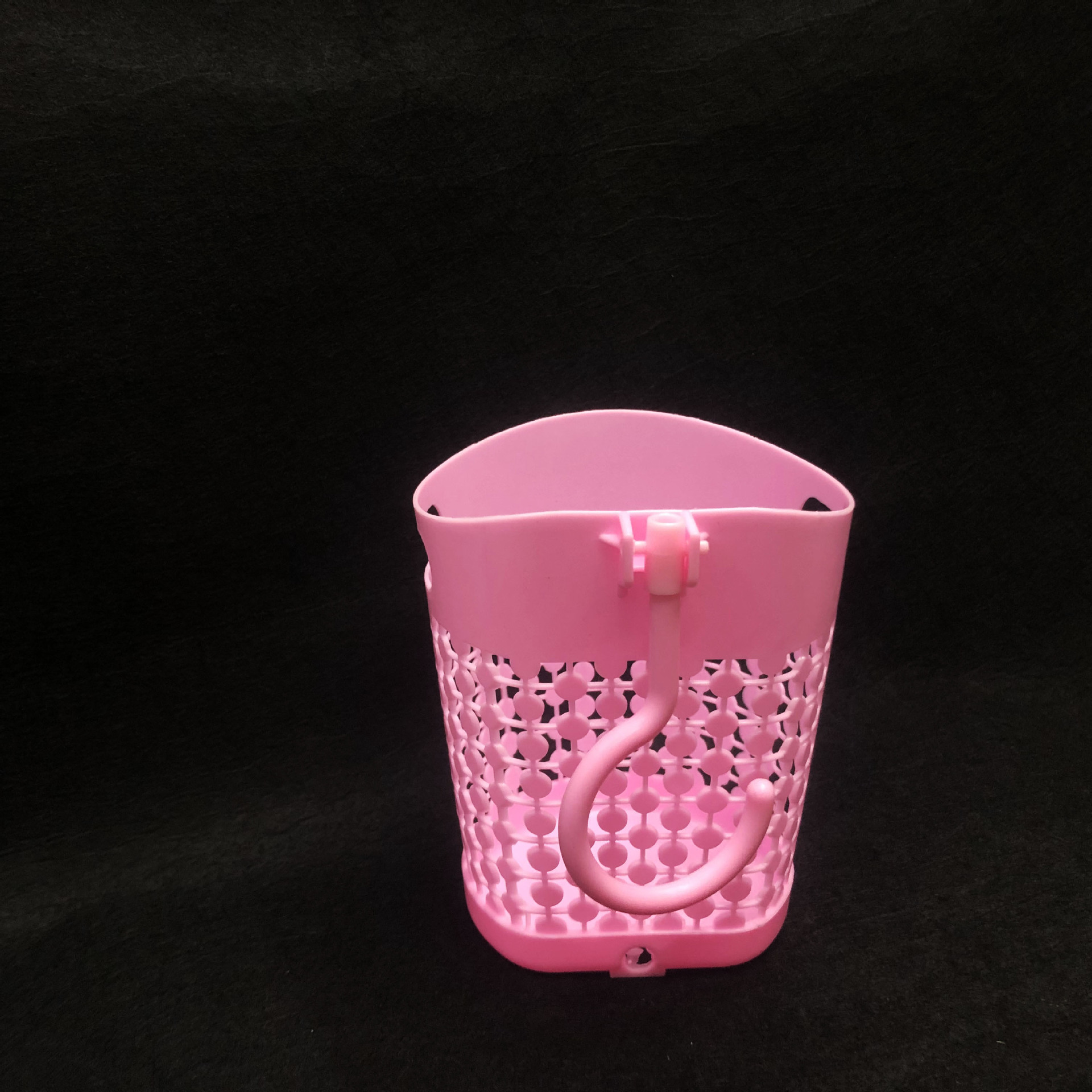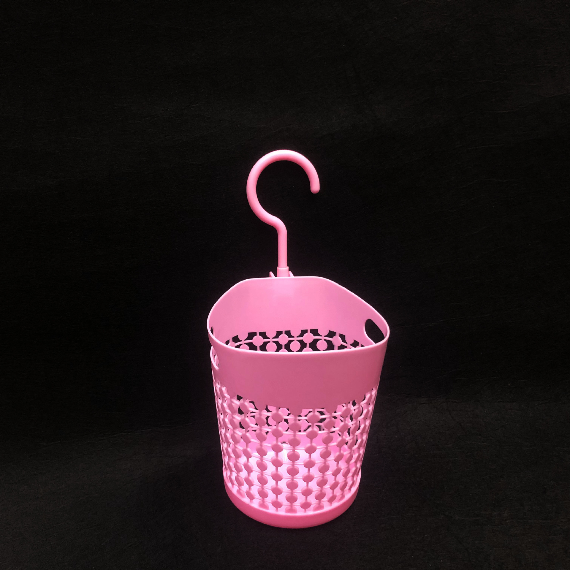 镂空挂钩收纳篓/办公室电脑桌面垃圾篓/可挂杂物收纳吊篮采用优质的PP材质制作而成,材料不含双酚A(BPA free)清新无异味,边缘镂空设计,高端大气上档次,糖果色色系,色泽前卫时尚,看去很简洁漂亮,手感圆润光滑,外型强度高耐用,硬度好,抗老化,寿命长,不怕摔,灰尘油污容易清洁,耐垢性好,低温下使用能保持相当好的韧性,经久耐用,方便收纳,可用来家居装饰,杂物收集,清洁收纳,摆件插花等,非常实用。带活动挂钩设计,吊篮可以悬空挂在任何你想挂的地方,方便收纳。是您居家生活的好伙伴,是家庭日用的优先选择。