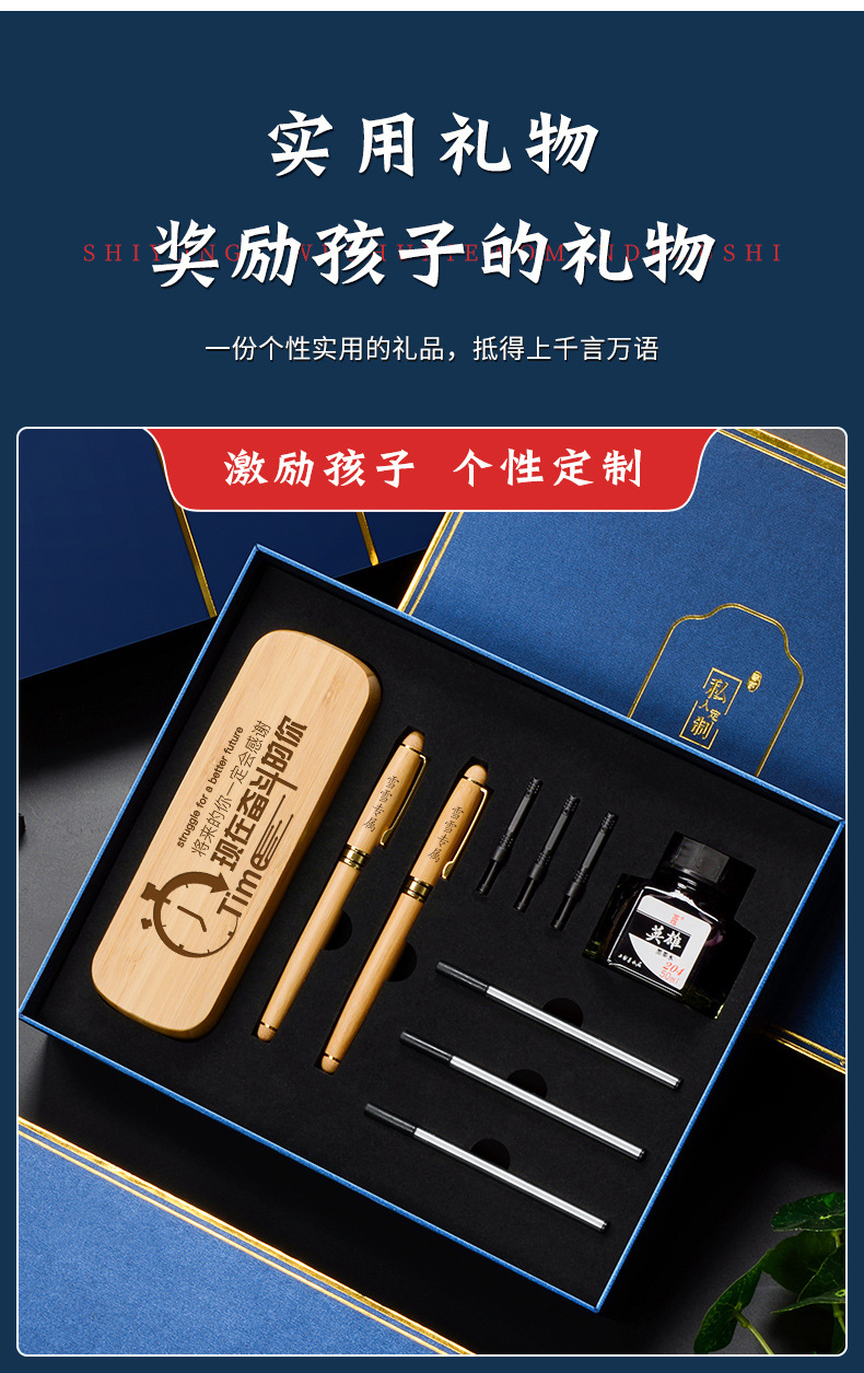 bamboo pencil case + red ebony pen + ebony bookmark + ink + pen bag/blue gift box