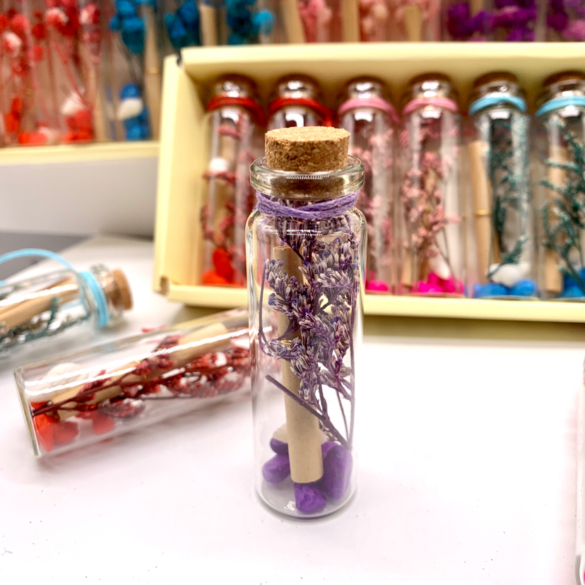 2022 New Style Everlasting Love Grass Wish Bottle A case contains 140 boxes Each box contains 12 pieces Each box has a mixture of 4 colors Bottle size: 2X7 Materials: Everlasting Love Grass, Lucky Small Color Stones, Cowhide Wish Paper, Cork Lid, Marine Little Conch