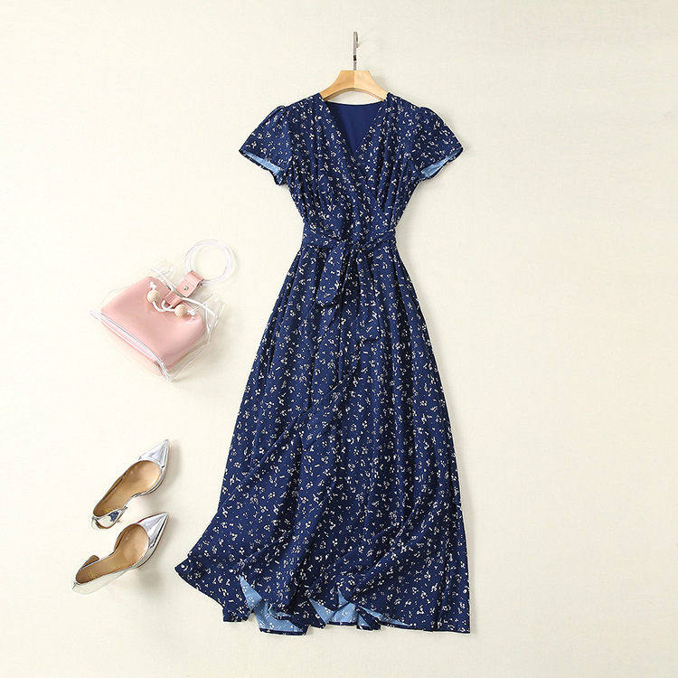 Hepburn Style Dress Women's 2022 Summer New French Retro Long Dress Waist-Tight Elegant Chiffon V-neck Floral Skirt