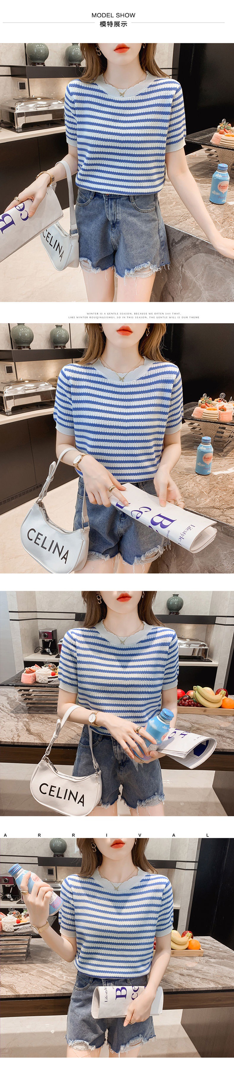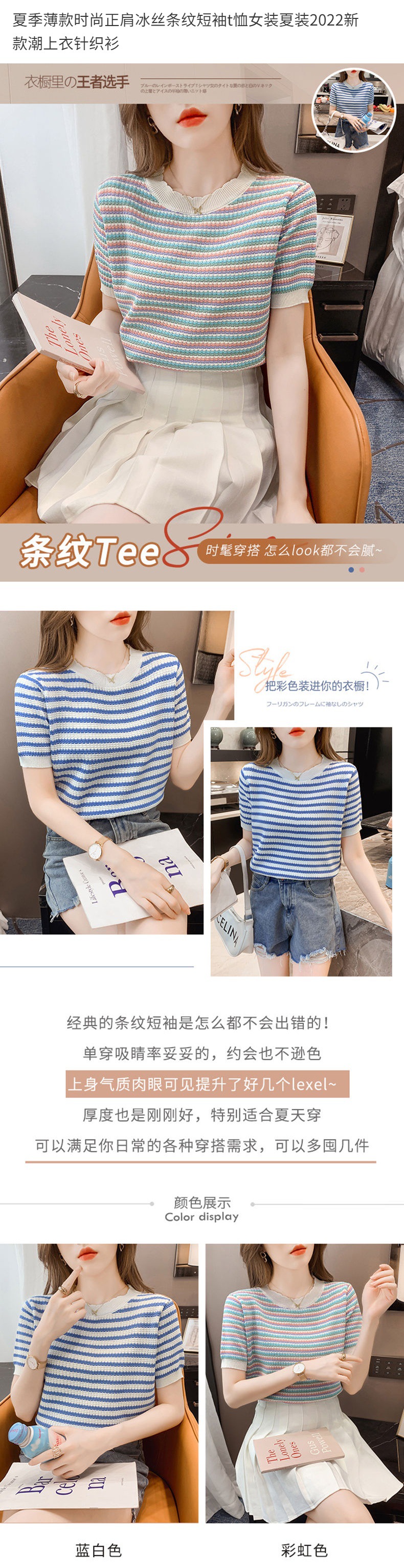 [Free Shipping for One Piece] Summer Thin Ice Silk Stripes Short-Sleeved T-shirt for Women New Top Sweater