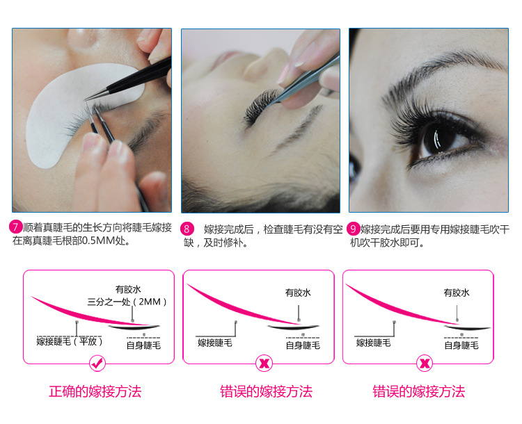 5. False eyelashes cannot stick to the root and skin of real eyelashes. Leave the root of real eyelashes 0.5-1MM and stick to 2/3 of real eyelashes.