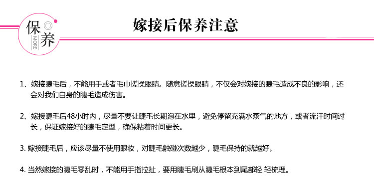 2. Do not touch water within 24 hours. Try to avoid eyelashes when washing your face. Do not rub false eyelashes. Do not wipe eyelashes with wool fabric to avoid falling off.