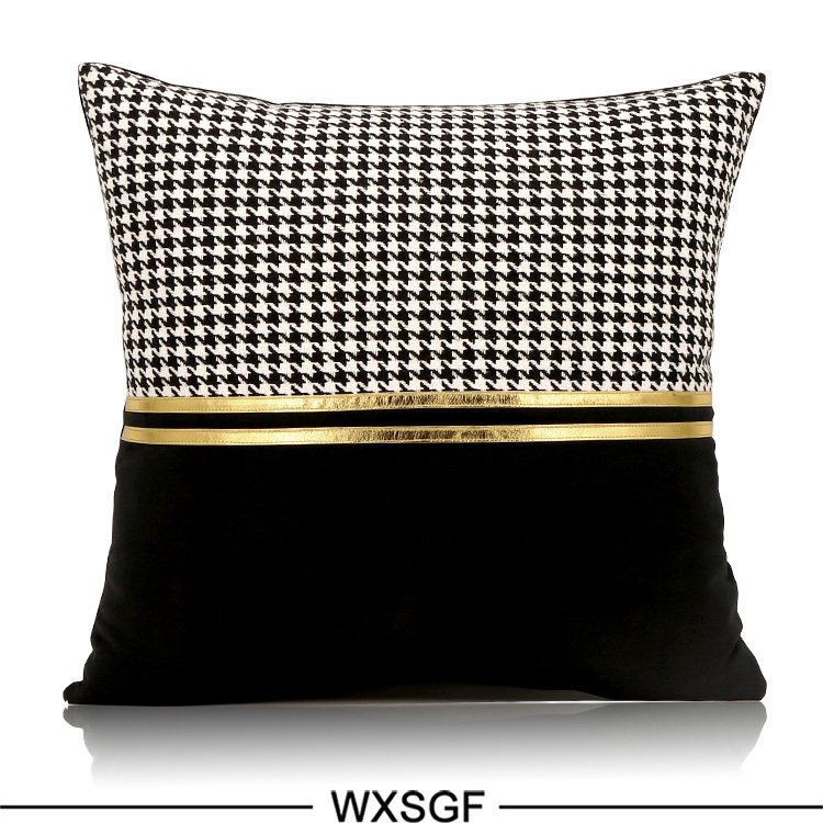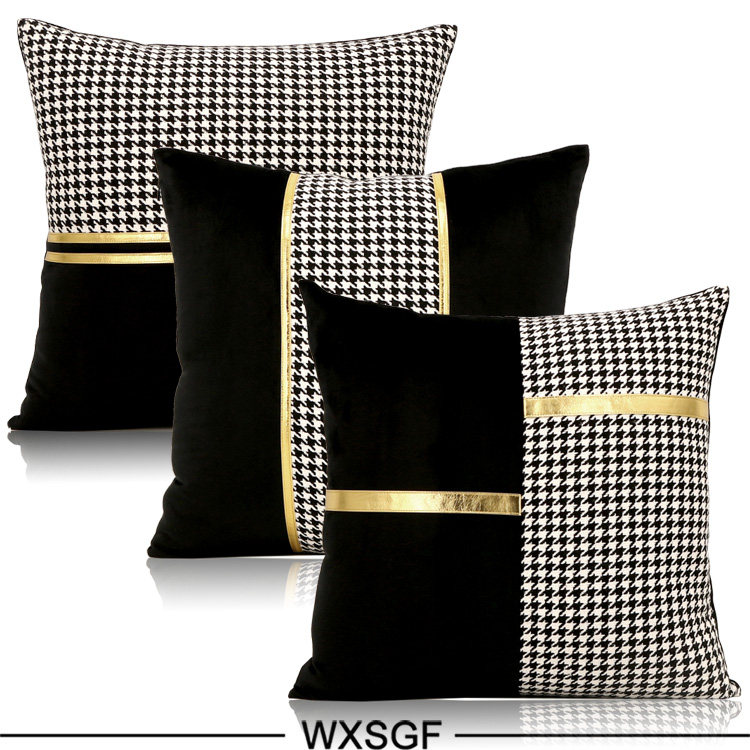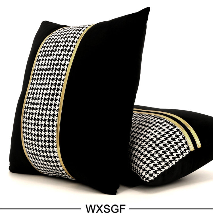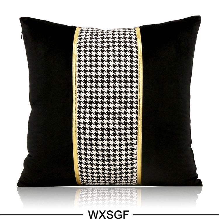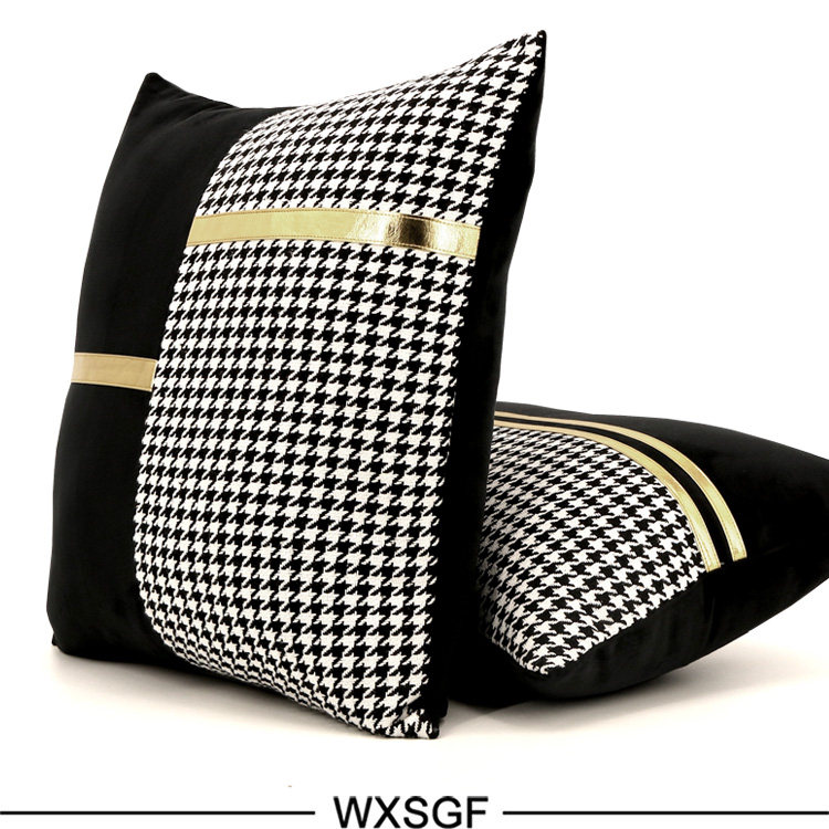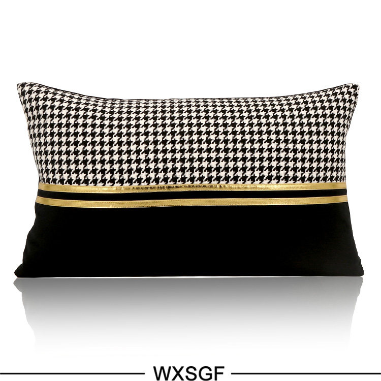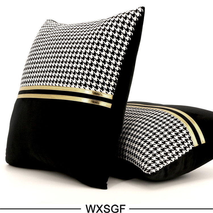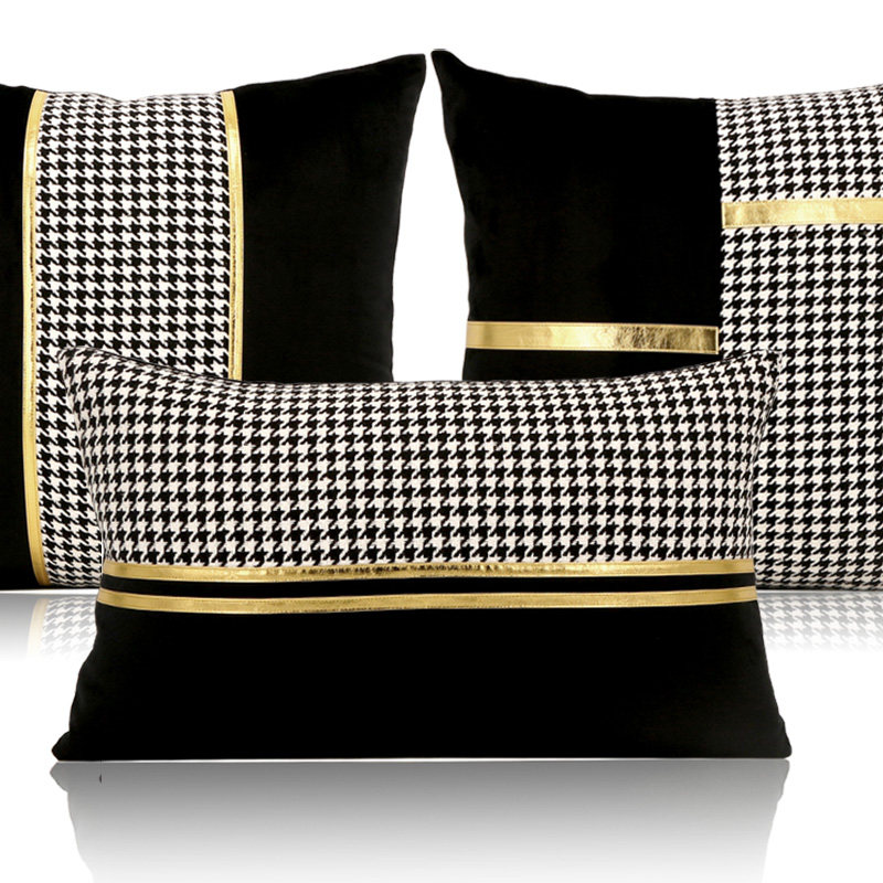 Simple and Light Luxury Sample Room Lumbar Support Pillow Pillow Cushion Black and White Houndstooth Golden Car Leather Strap Stitching Black Velvet