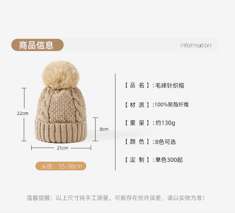 Hat Female Korean Style New Autumn and Winter Hat Fur Ball Thickened Coarse Yarn Knitted Hat Warm with Velvet Earflaps Slipover Hat