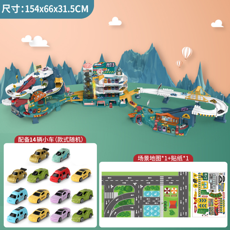 Children's car obstacle course adventure parking building electric roller coaster dinosaur mountain road track car toy