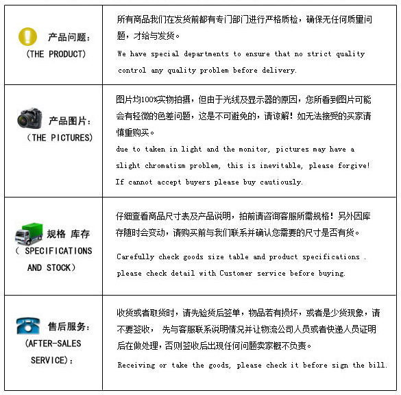 Shopping notice: the price of our products does not include tax points, and the invoice is added with tax points. For more information, contact customer service. Some products and remote areas (such as Xinjiang, Tibet, Hong Kong, Macao, Taiwan, etc.) cannot be free shipping. For more information, please ask customer service to modify the freight. Some products are sold on the pre-sale page at prepaid deposit, please contact customer service for confirmation before placing an order. Some product styles are slightly different from the page pictures. Please confirm the specifications and styles with customer service before placing an order to avoid misunderstanding, sorry for the inconvenience!