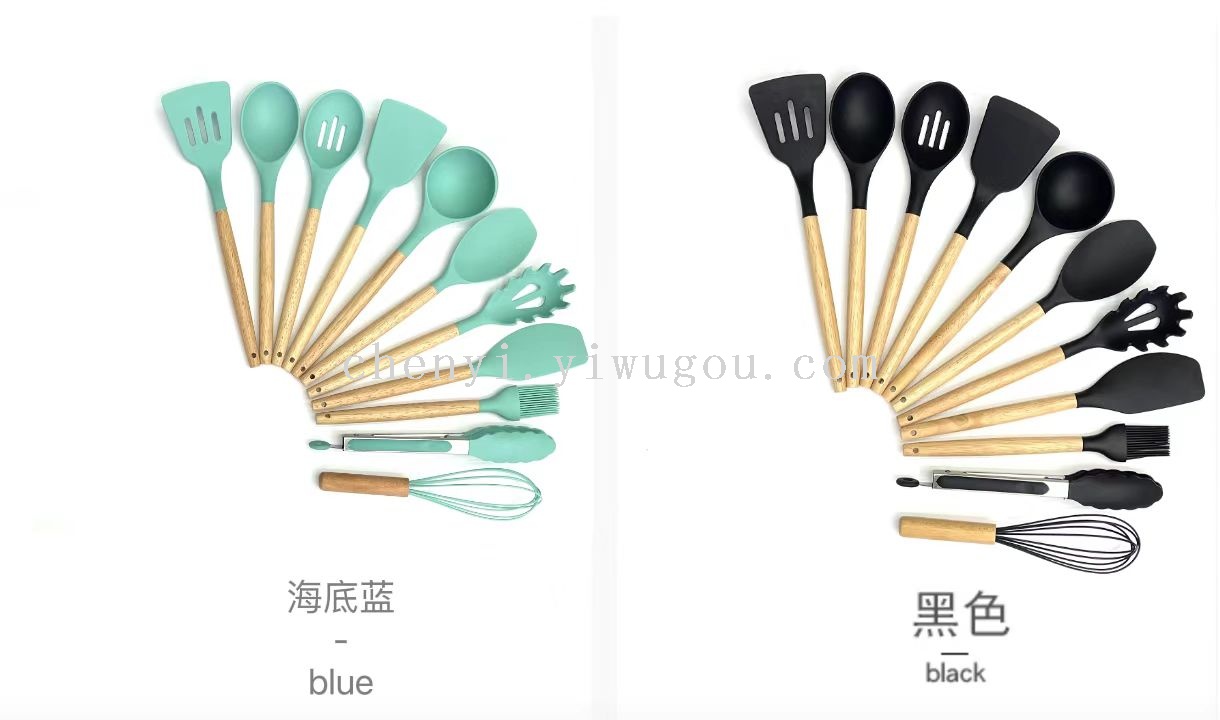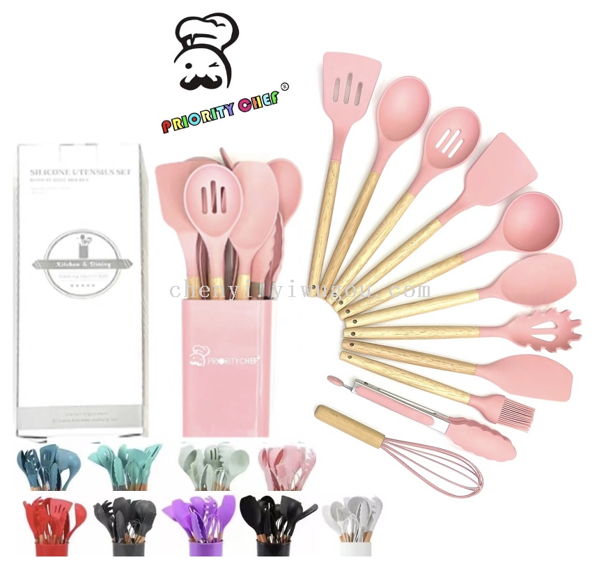 wooden handle silicone kitchenware square bucket 12-piece cooking shovel spoon high temperature resistant silicone color box silicon suit kitchen utensils