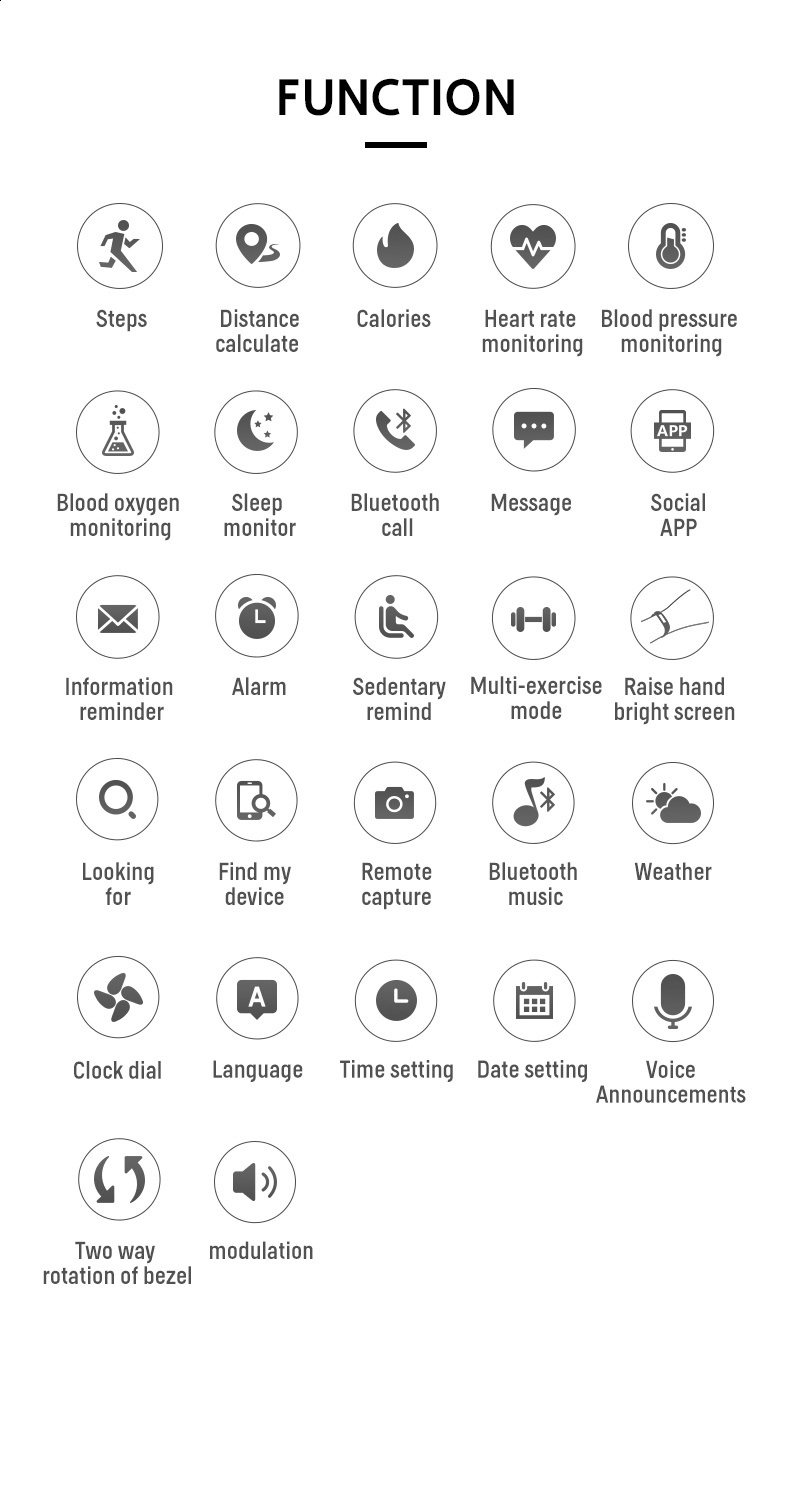 | 基本功能 | 计步、距离、卡路里、心率/血压/血氧监测、蓝牙通话、蓝牙音乐、测温、睡眠监测、来电提醒、短信提醒、社交APP消息提醒、闹钟提醒、久坐提醒、多运动、翻腕亮屏、寻找手环、寻找手机、远程拍照、拒接电话、勿扰模式,多表盘切换 | basic function | step、distance、Calorie、Heart Rate/Blood Pressure/Oxygen 、BT call、BT Music、Temperature、Monitoring、Sleep monitoring、call reminder、SMS Alerts、Social APP Message Reminder、Alarm clock reminder、A sedentary reminder、sport、Turn the wrist and shine the screen、Looking for bracelets、Looking for Phones、Remote Photography、Rejection of calls、Do Not Disturb、Multi-dial switching | ||