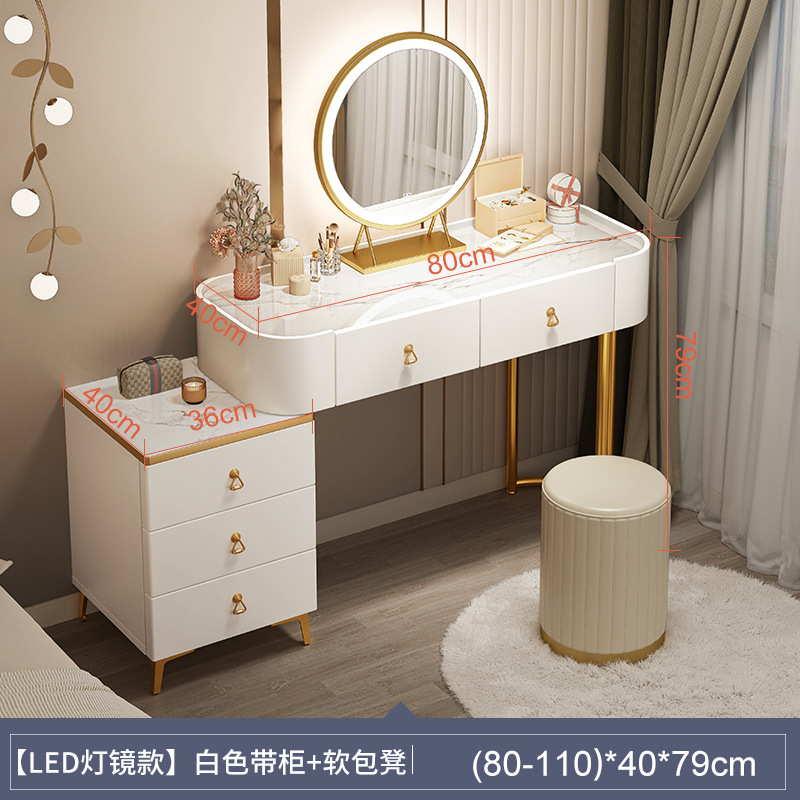 [table + side cabinet + smart light mirror + soft fabric covered stool] 80cm elegant white: spacious desktop three-side fence