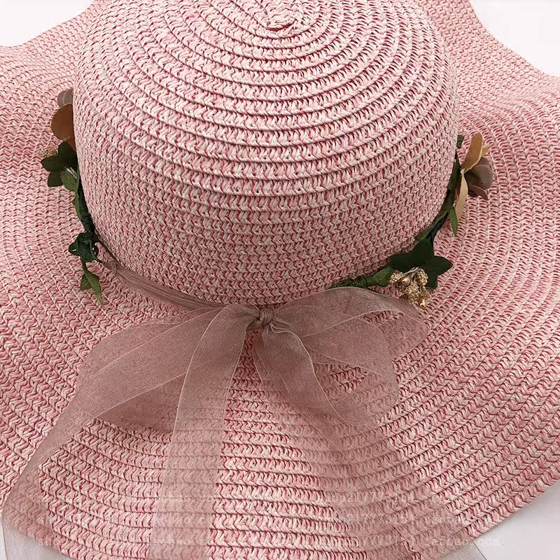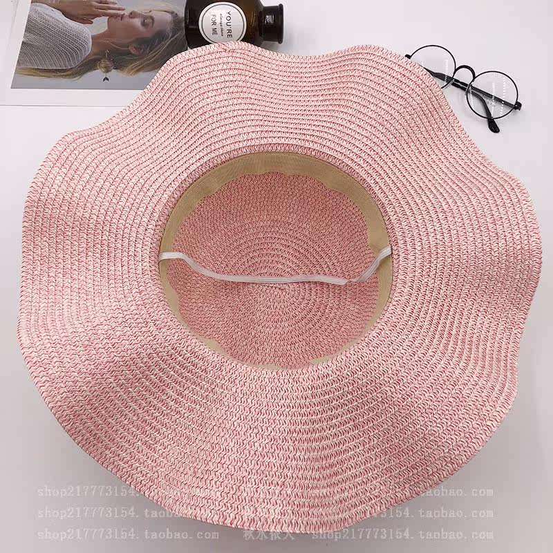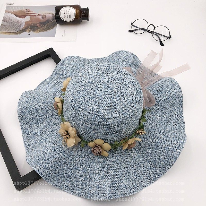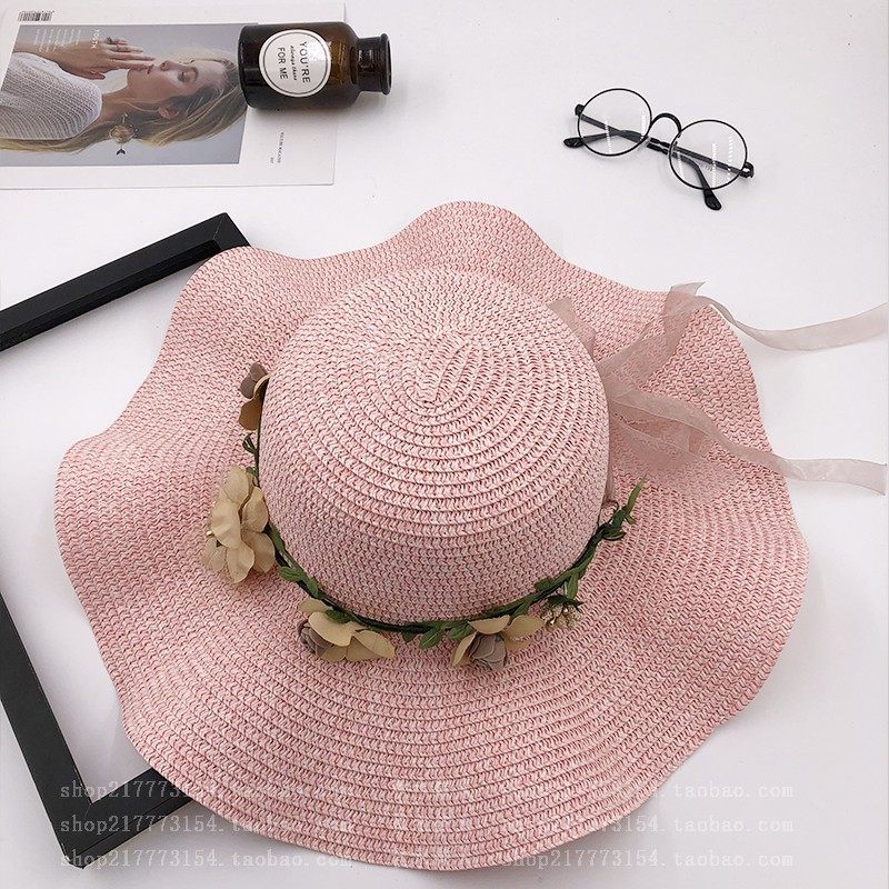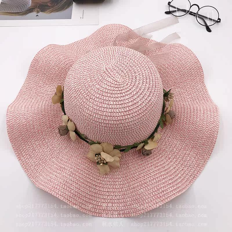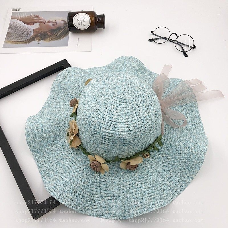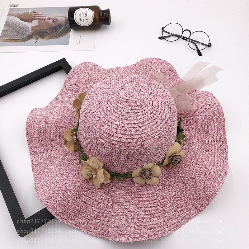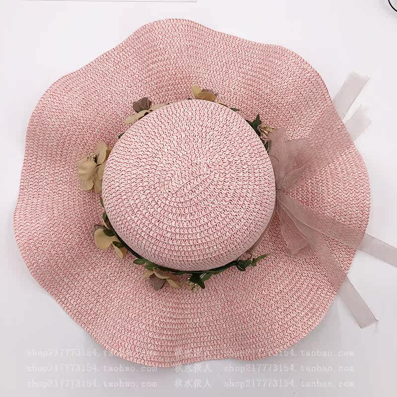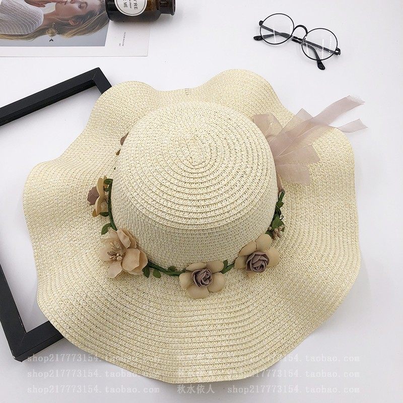 spring and summer big brim wavy edge snow yarn lace-up bow satin exquisite rose garland travel female leisure straw hat