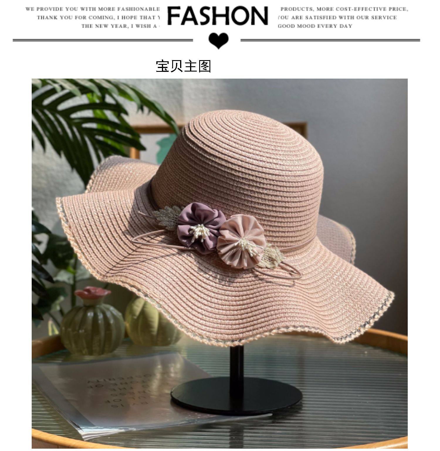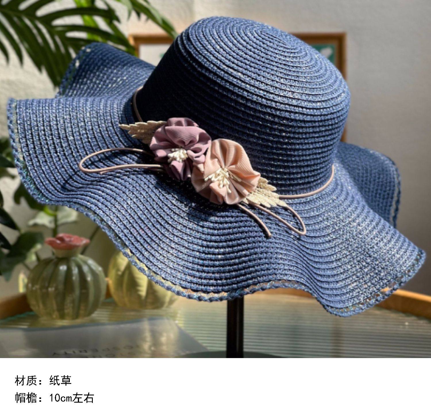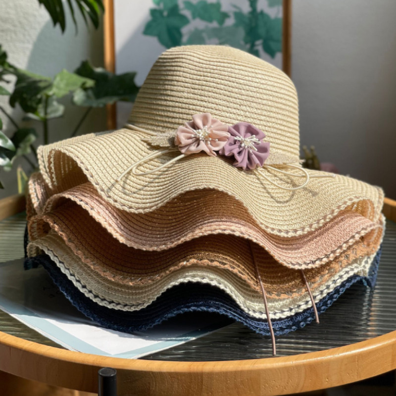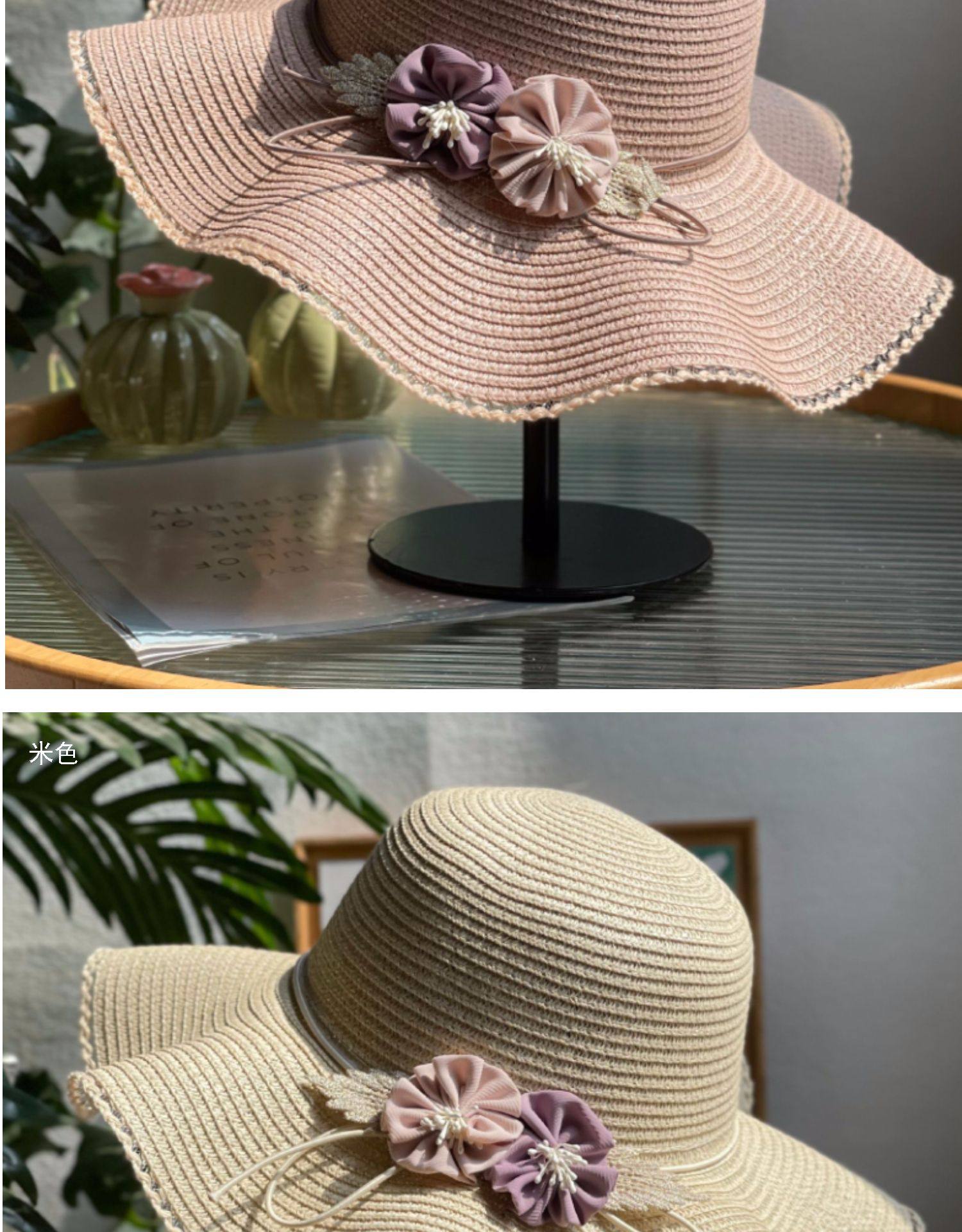 big brim flower straw hat women's sun hat vacation beach hat pastoral style fashion beige sun hat with wooden ears