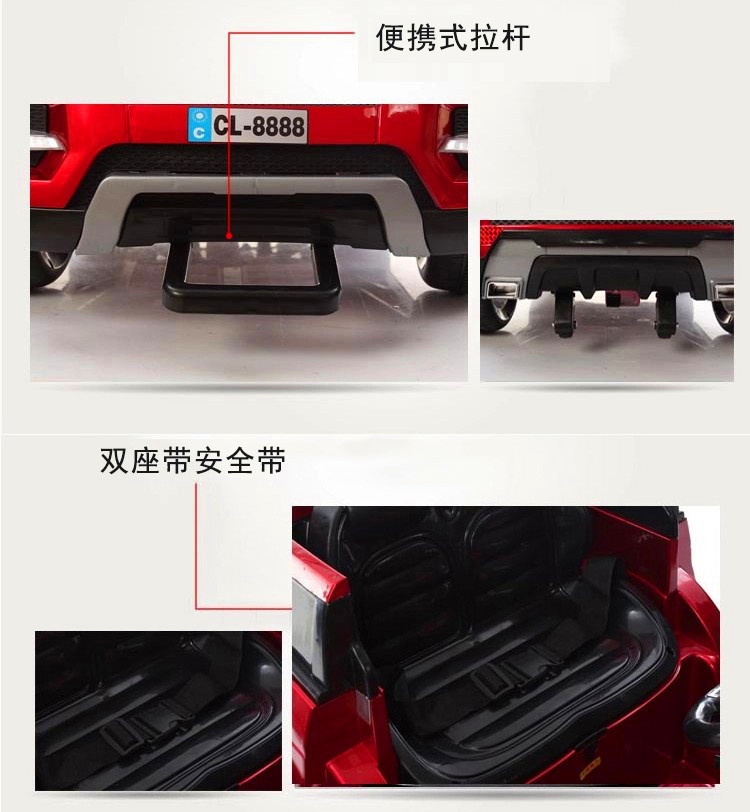 Double 6v4 battery, dual 380 drive, double high-low door, one-button start, 2.4g to one Bluetooth remote control, front and rear sway, early education function, English stories, LED headlights, USB ports, MP3 ports, four-wheel shock absorption, convenient pull handles.