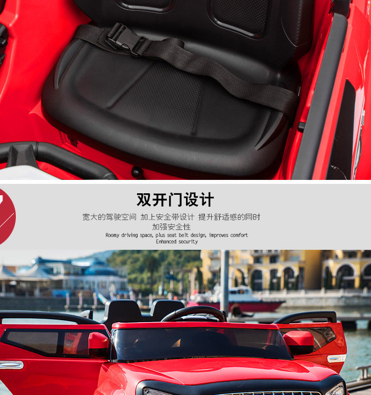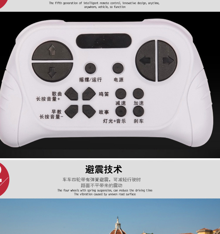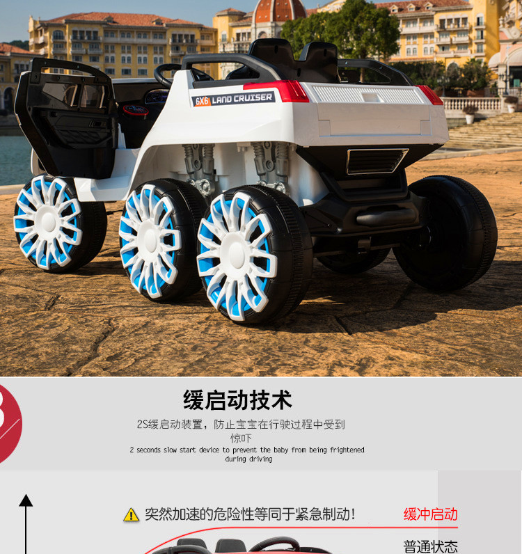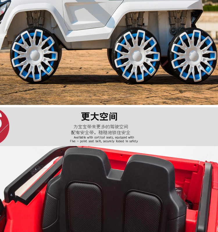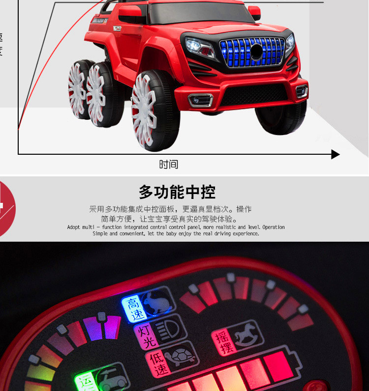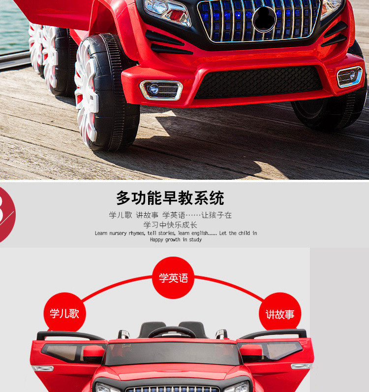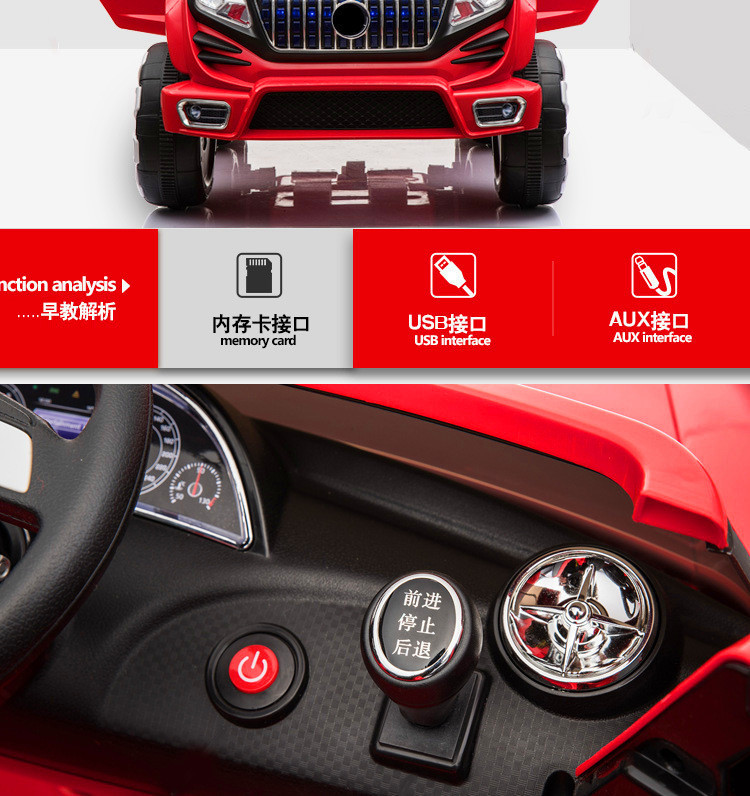 Function configuration: Standard configuration: Simulated rear-wheel drive concept off-road vehicle, large capacity battery, four-wheel shock absorbers, independent sway, early childhood education music, USB port, MP3 port, memory card port, cool-looking colorful lights, slow start, pull rod function, trunk, dazzling lights, 2.4G multi-function Bluetooth remote control, 12V7 large battery, 540 sway motor, 390 driving motor.