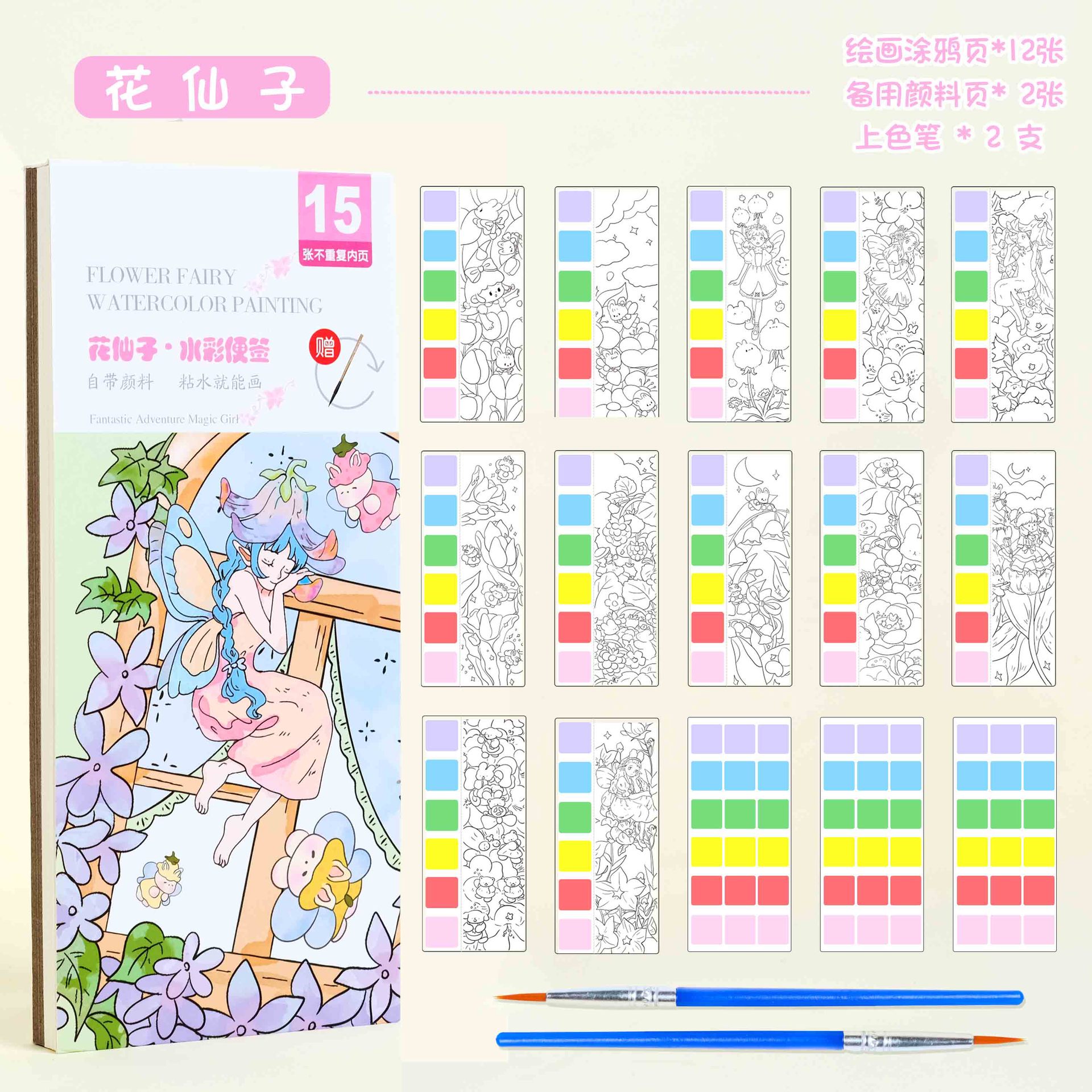 花仙子【12张内页不重复+3张颜料备用页+2支上色笔】