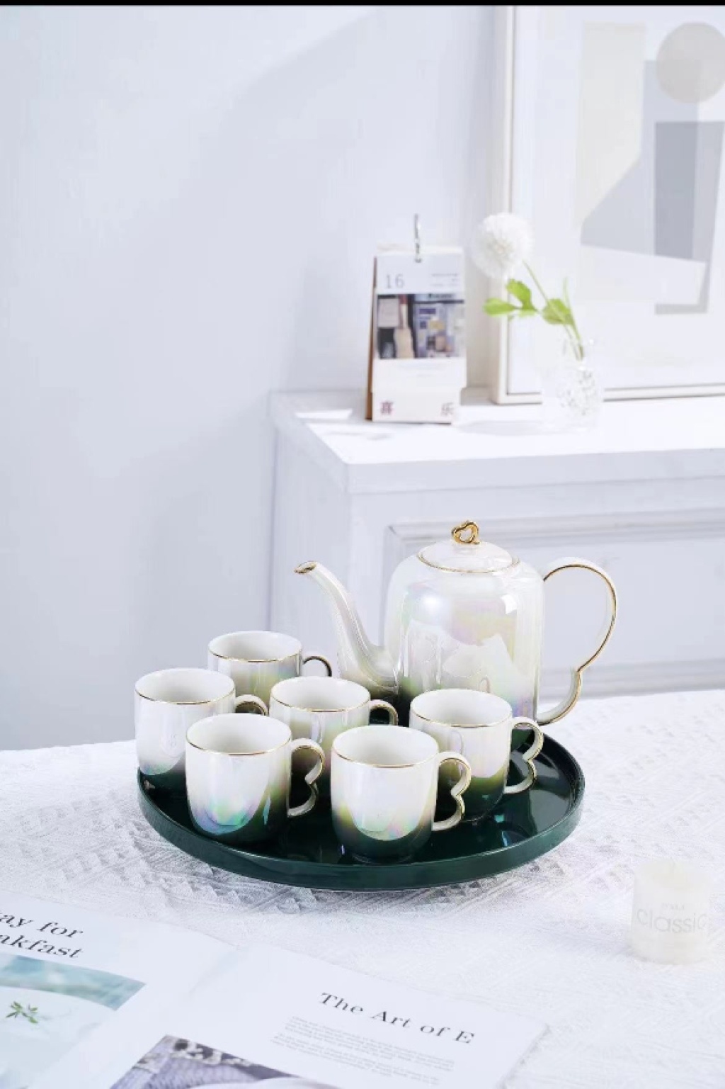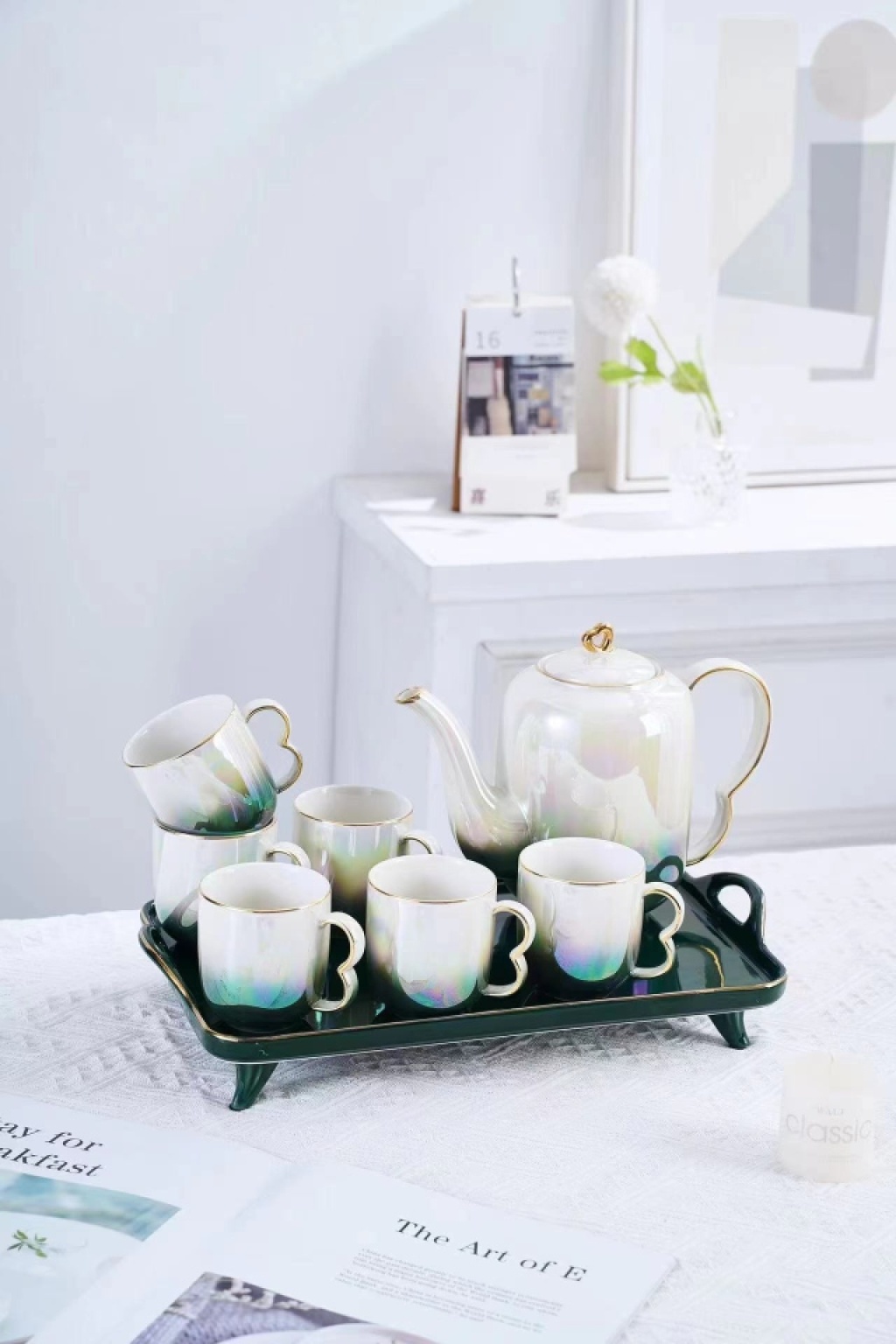 a pot of 6 cups and a tray of drinking ware