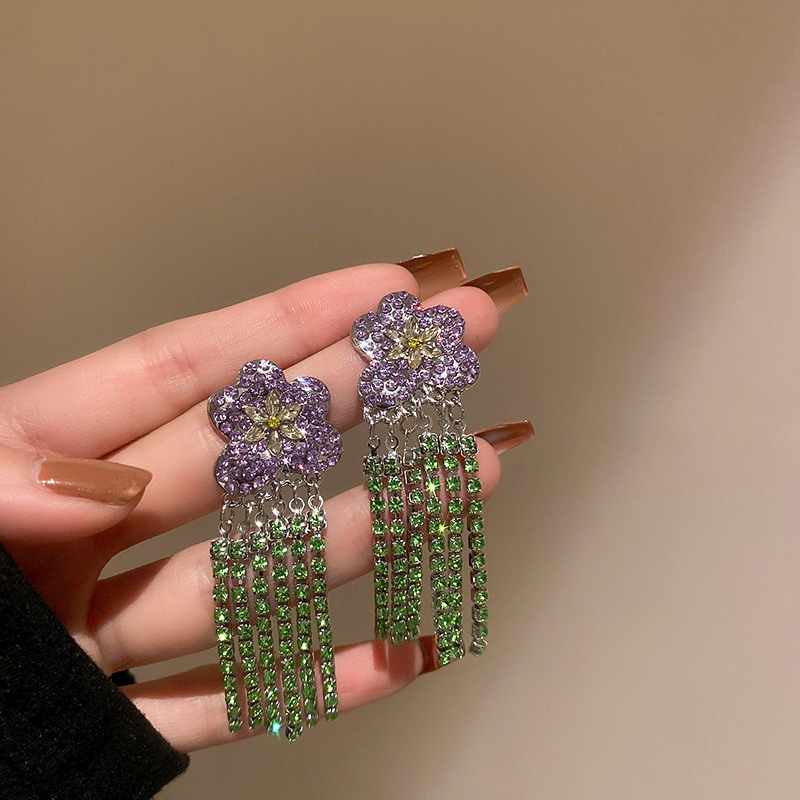 31# silver needle. flower crystal tassel earrings