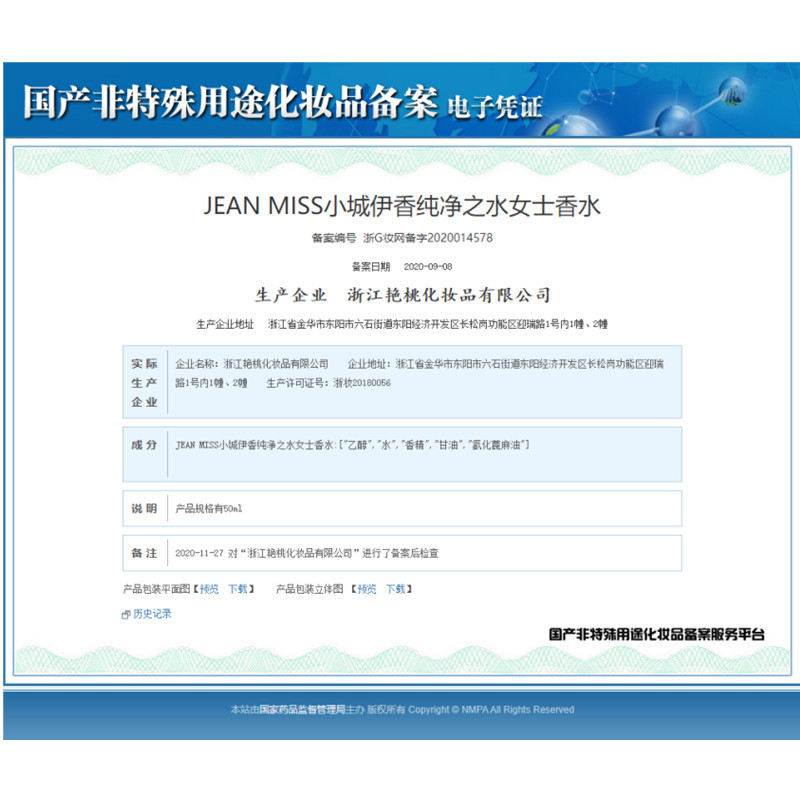 JEAN MISS 小城伊香纯净之水女士香水 浙G妆网备字2020014578