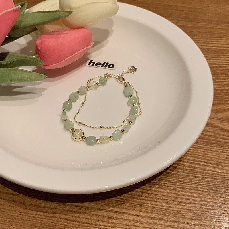 21 real gold plated green-natural stone round beads double layer bracelet
