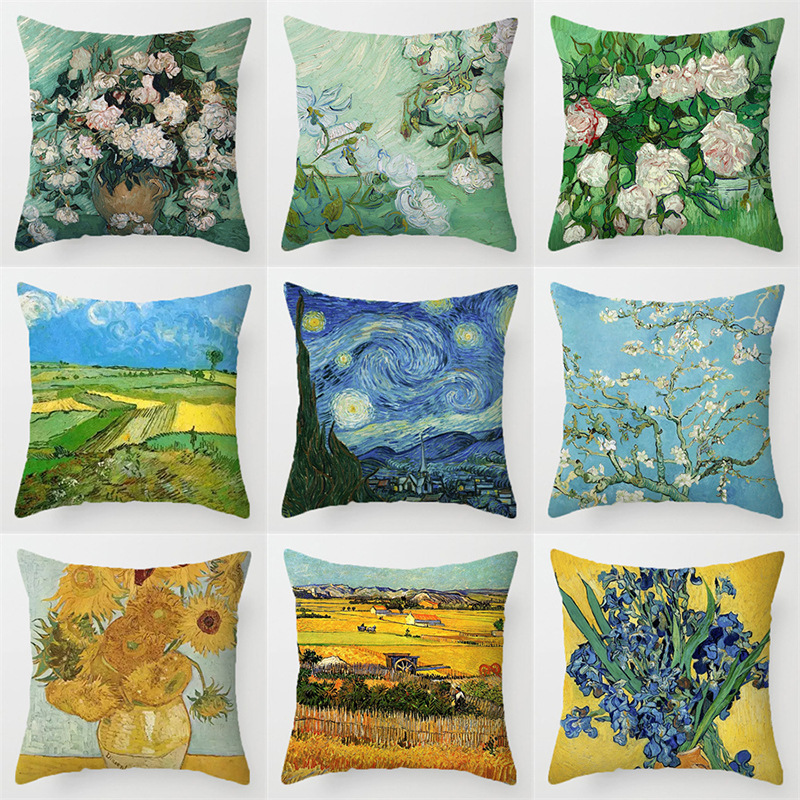 European Pastoral Style Van Gogh Vintage Oil Painting Pillow Cover Creative Living Room Sofa Decorative Cushion Waist Pillow Bedside Backrest
