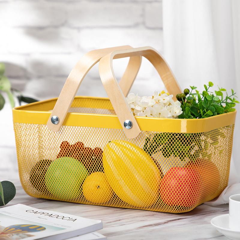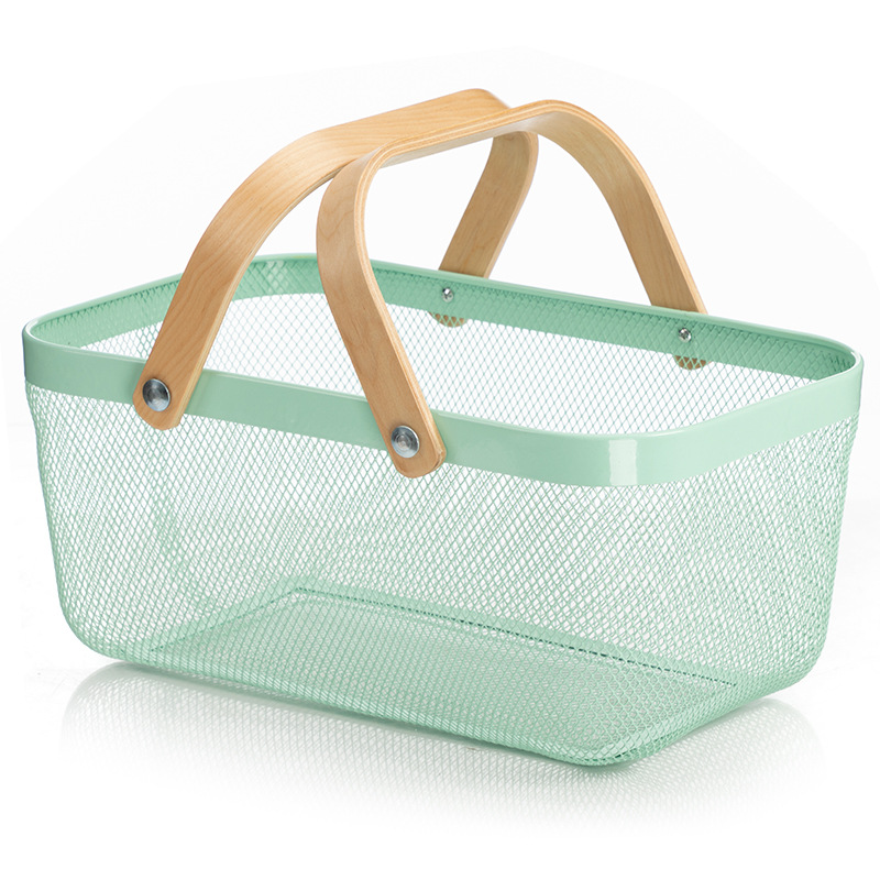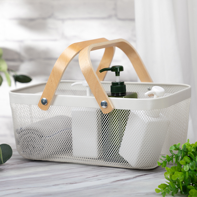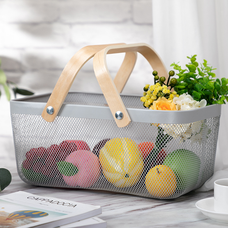 Household Iron Net Wooden Handle Storage Basket Fruit Vegetable Basket Desktop Sundries Dormitory Skincare Storage Basket