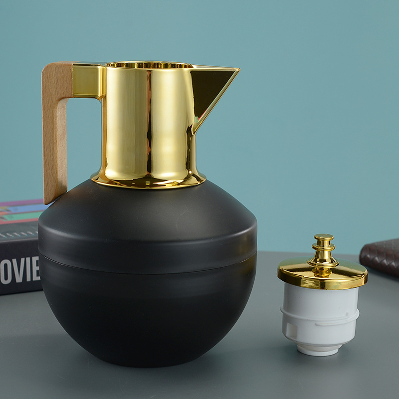 此款特点为1000ML玻璃红内胆,塑料外壳,头部镀金,木质榉木手柄