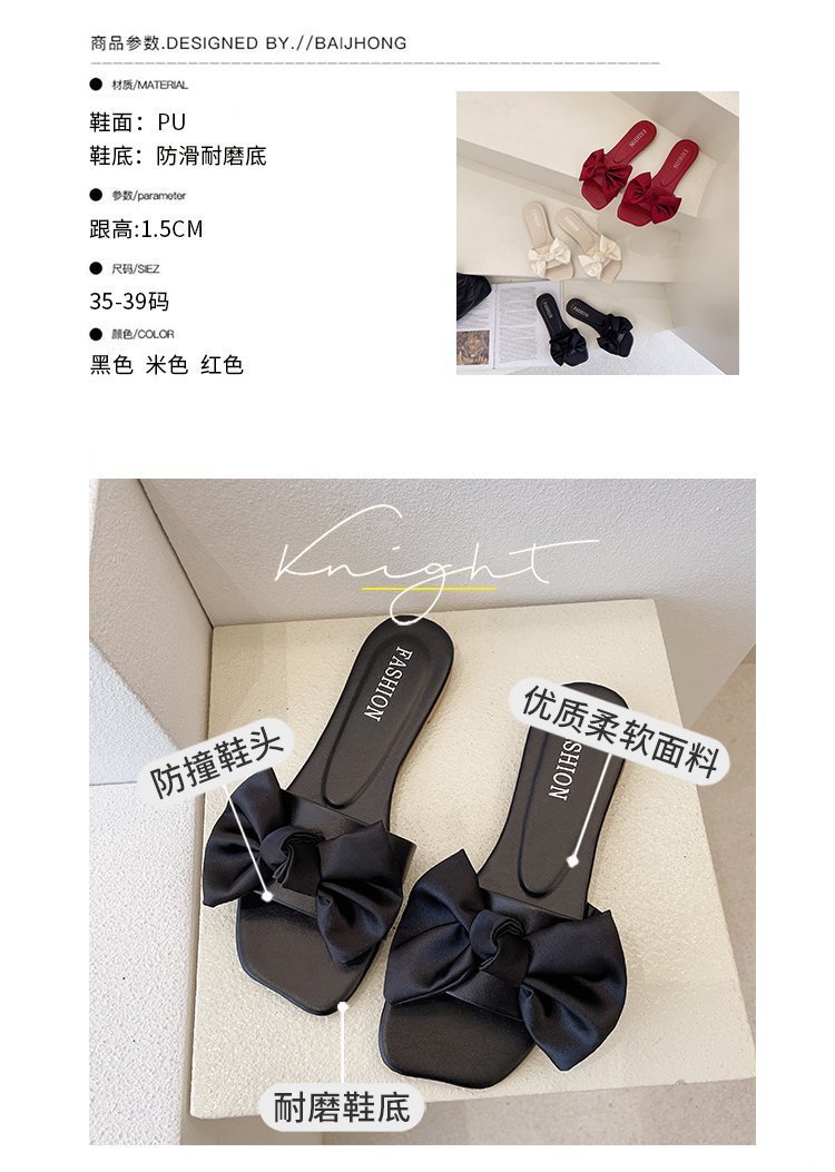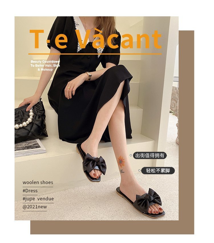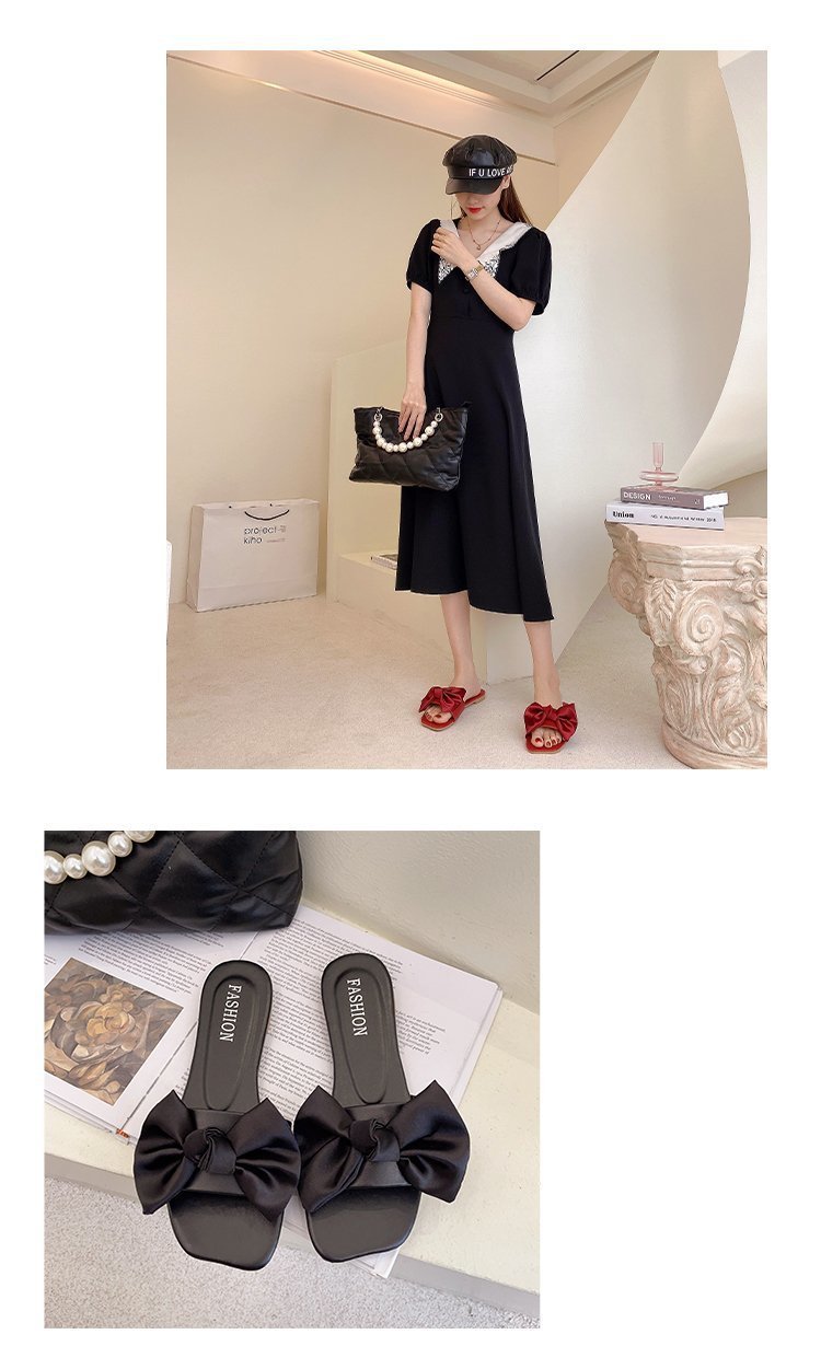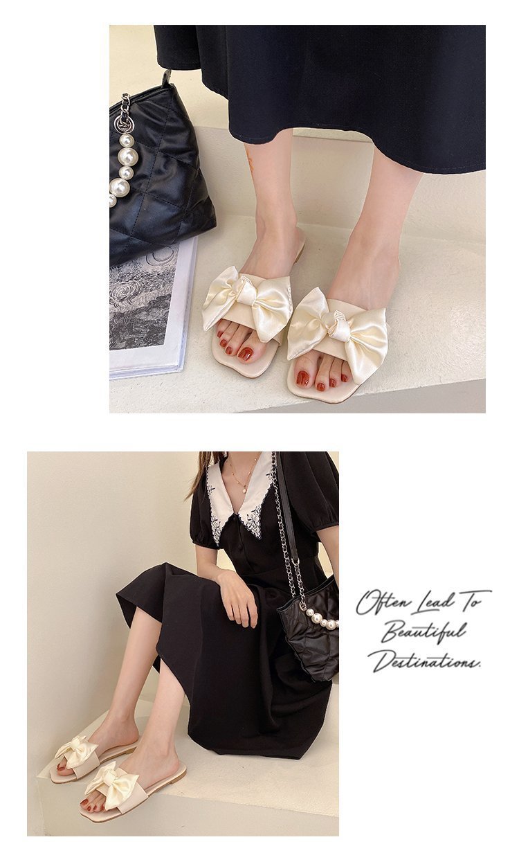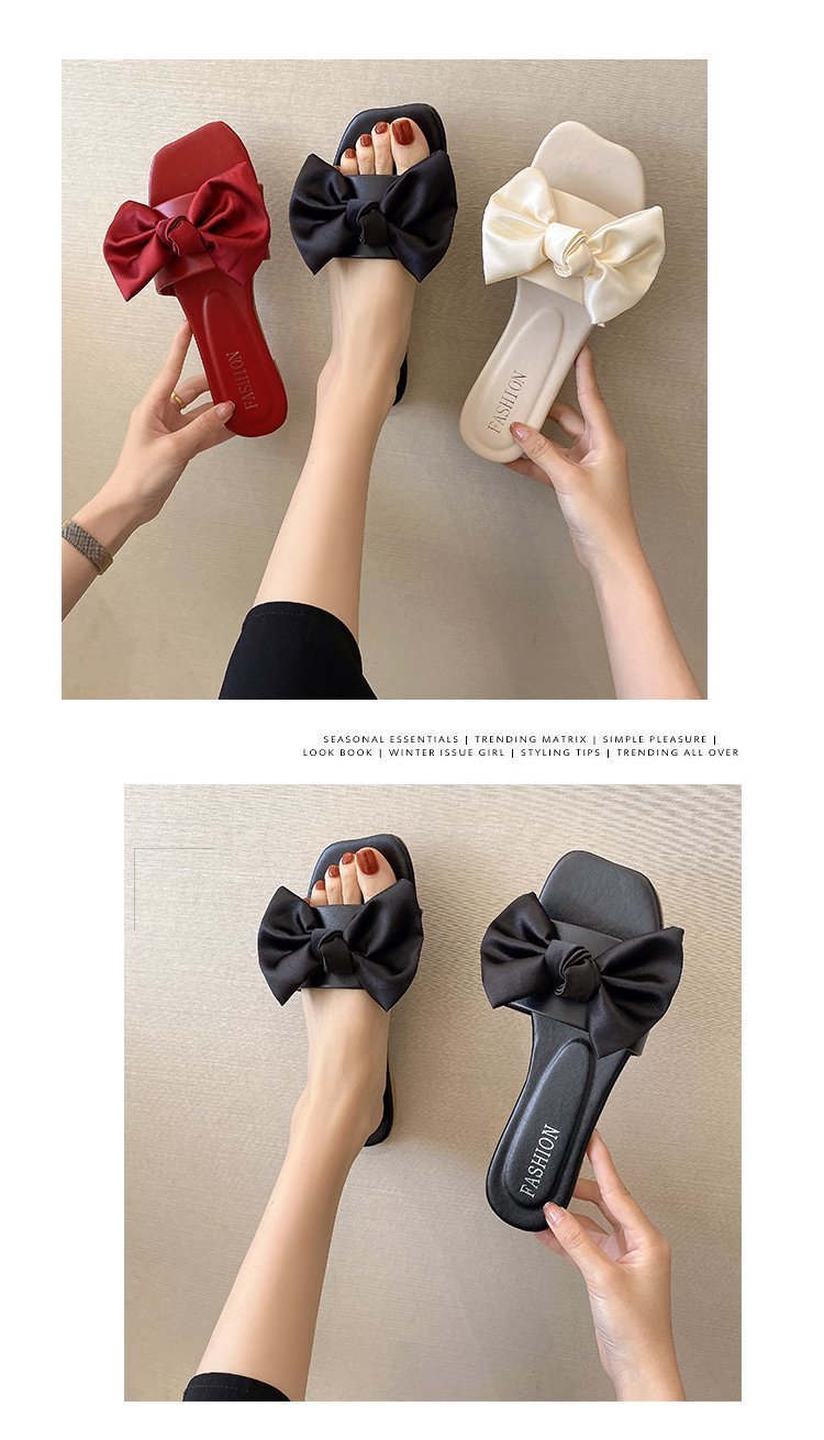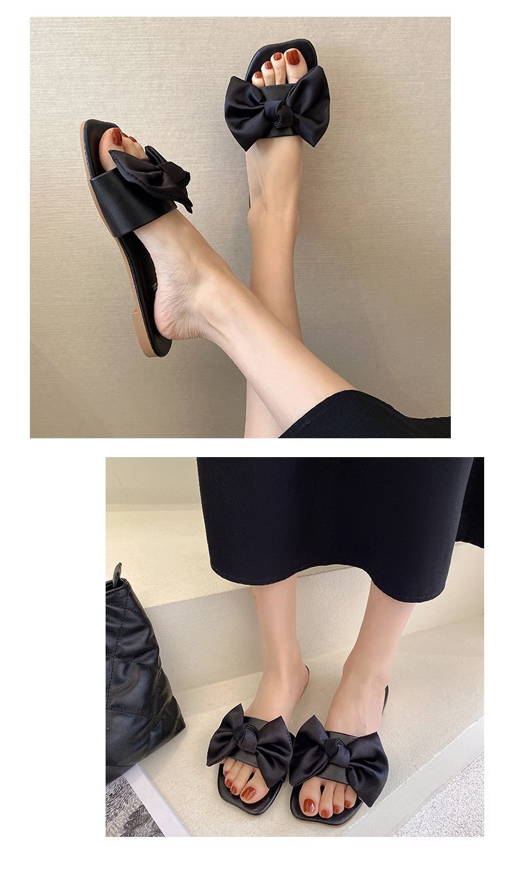 Women's 2022 Summer Korean New Flat Square Toe Bowknot Home Slippers for Women