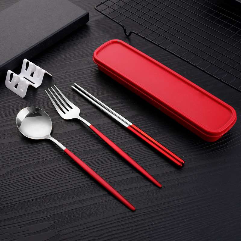 red silver 3-piece set {spoon + fork + chopsticks + box}