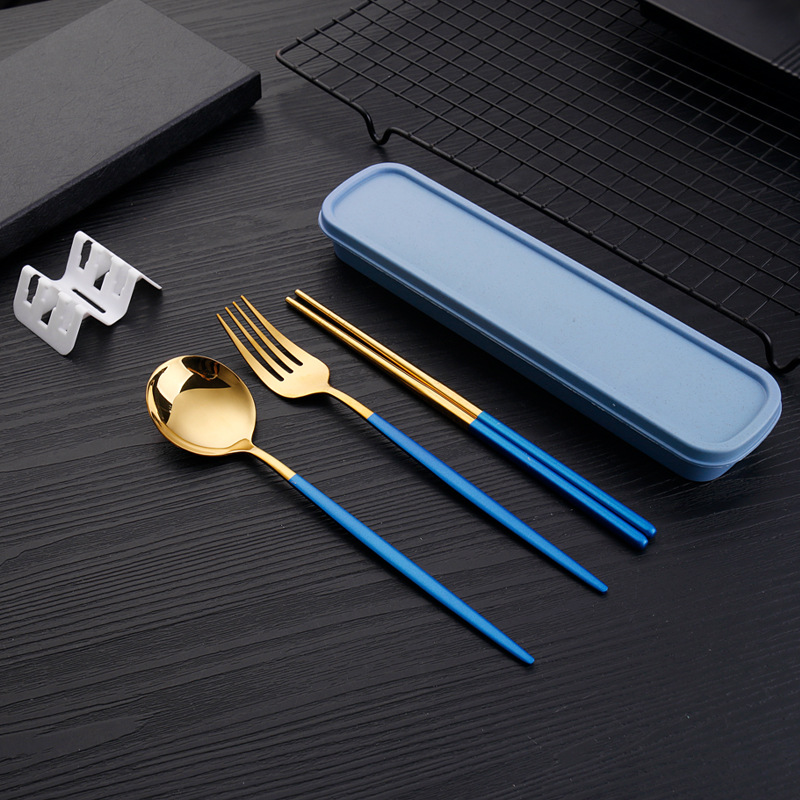 blue gold 3-piece set {spoon + fork + chopsticks + box}