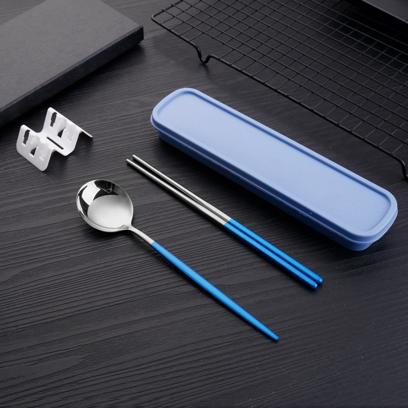 blue silver 3-piece set {spoon + fork + chopsticks + box}