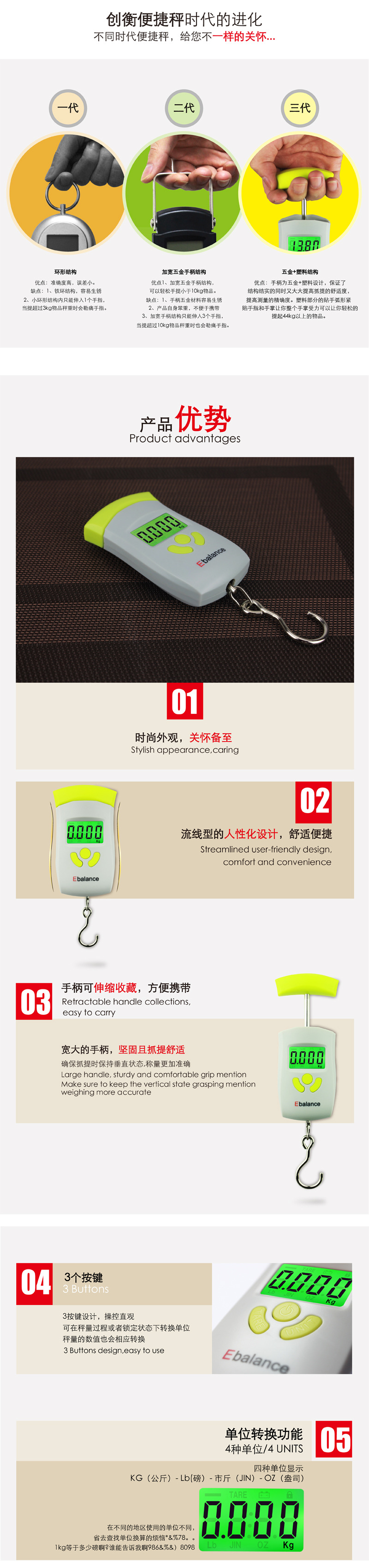 Material: ABSPlastic parts, high-precision sensors, with buzzer sound.Please provide the Chinese text you want to translate, and I will translate it into English for you.Blue Backlight Selection.The product line is smooth, the structure is strong, the volume is small, convenient to carry, and the function is diverse. The weight unit is ..."kg/lb/ jin/ oz" 可以翻译为 "kilograms/pounds/jins/ounces"。Convertible, weight automatically locks for easy reading. 30The device will automatically turn off after one second to protect the battery and extend its usage time..